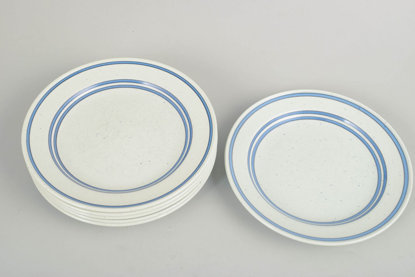 Stig Lindberg for Gustavsberg, seks tallerkener.Sæt af salattallerkener i fajance med enkel, rund form og diskret dekoration i blå linjer på lys bund. Tallerkenerne er udført i Gustavsbergs “Dart”-serie, kendetegnet ved sit stringente og grafiske udtryk, som er typisk for Stig Lindbergs produktion i perioden.