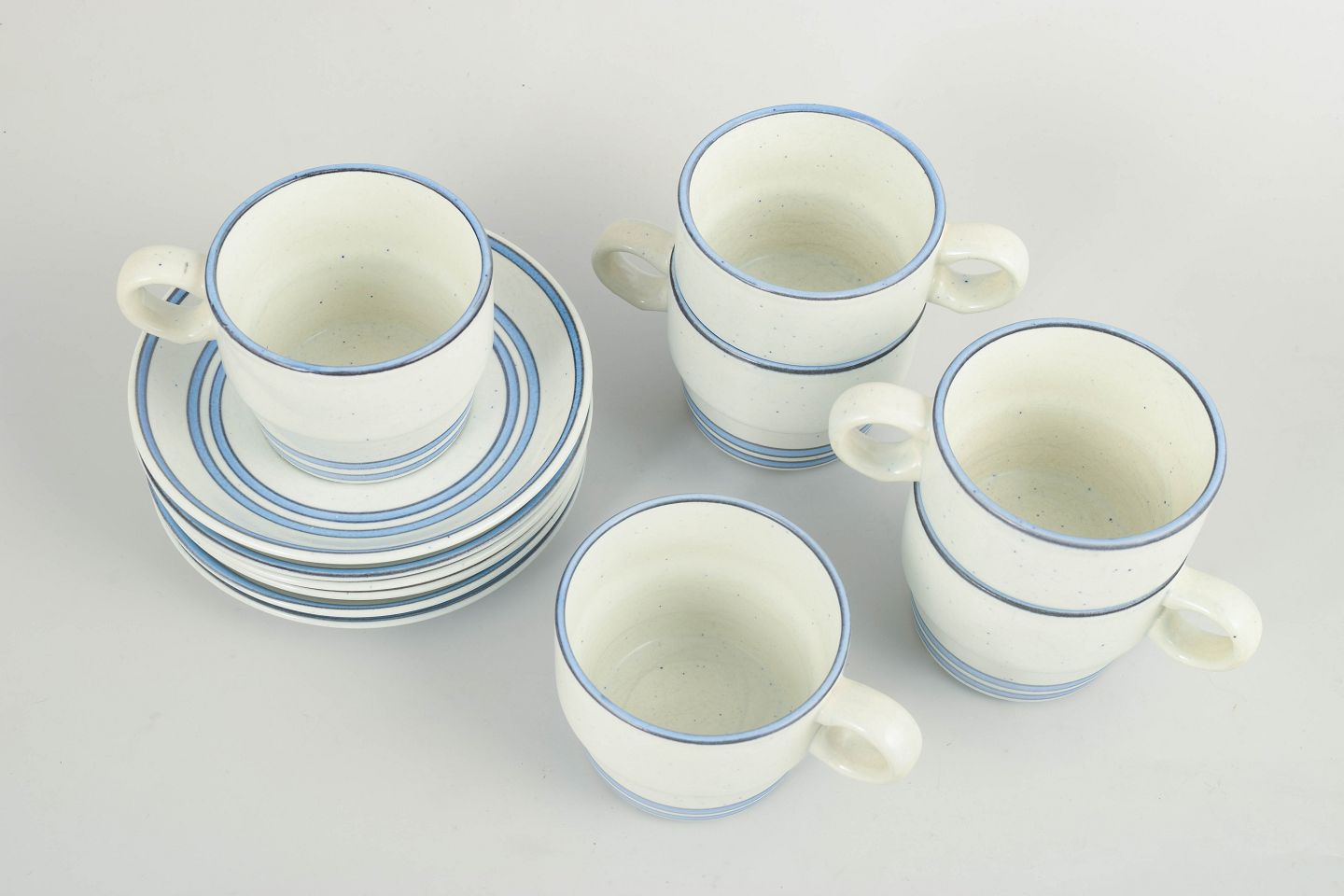 Stig Lindberg for Gustavsberg, kaffesæt.Sæt med seks kaffekopper med tilhørende underkopper i fajance. Serien er udført med enkle cylindriske former, let udadbøjede hanke og diskret dekoration i blå linjer på lys bund, karakteristisk for Stig Lindbergs funktionelle og grafiske formsprog. Udført efter Gustavsbergs model “Dart”.