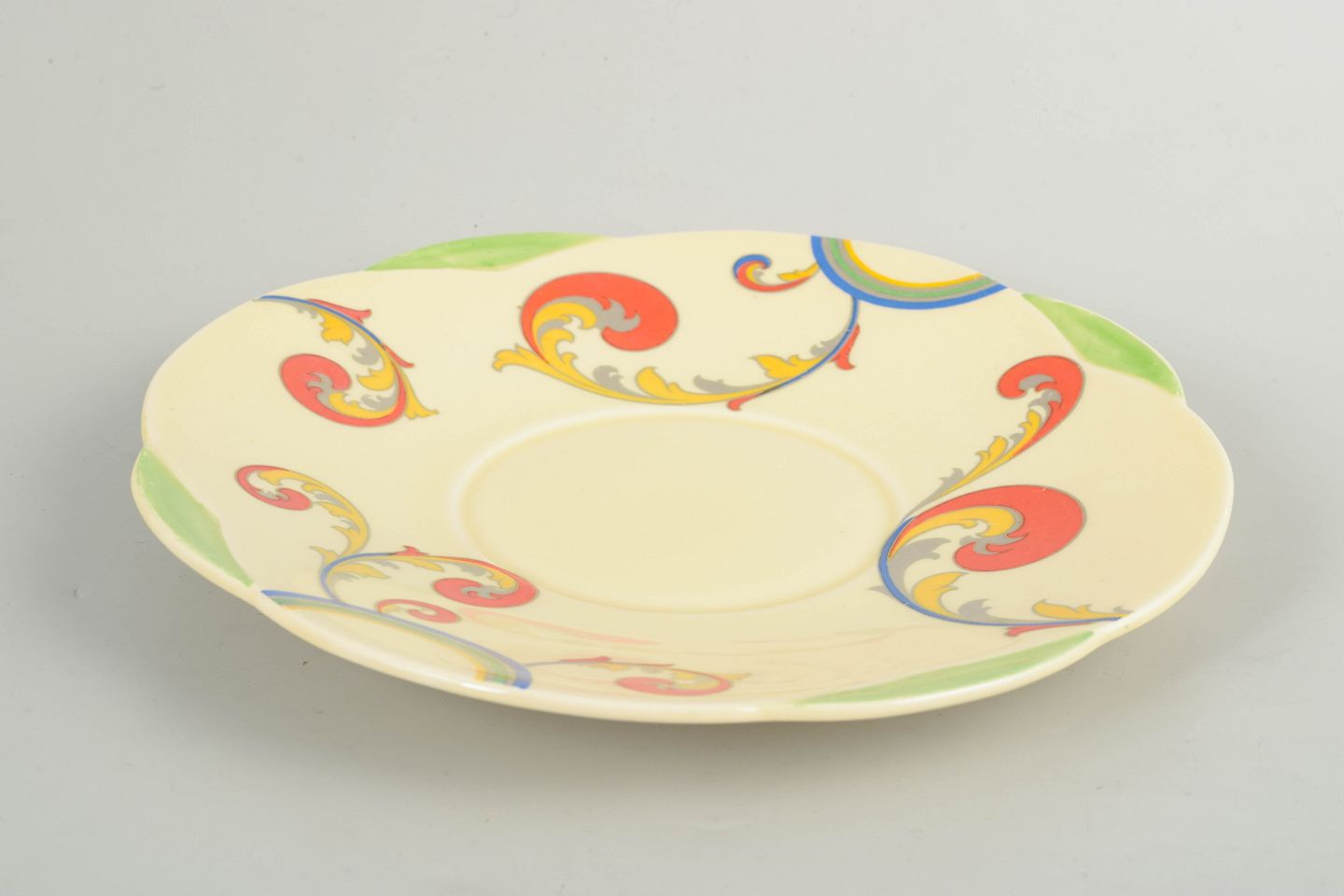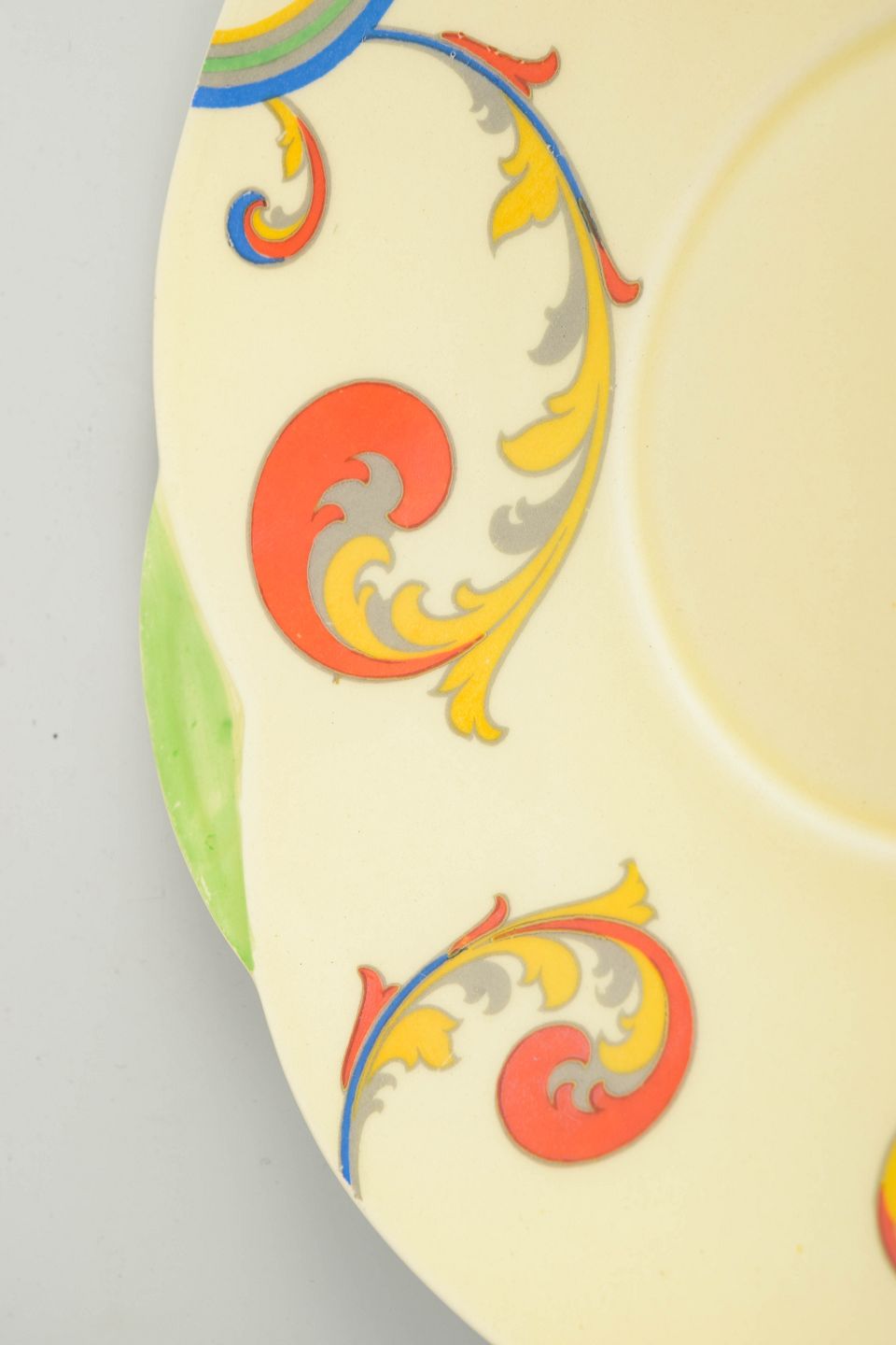 Clarice Cliff for Royal Doulton, serveringsfad.Art deco-serveringsfad i fajance med håndmalet dekoration i “Syren”-serien. Fadet har rund form med let bølget rand og et dynamisk, stiliseret blomstermotiv i klare, kontrasterende farver, typisk for Clarice Cliffs dekorative formsprog i mellemkrigstiden.