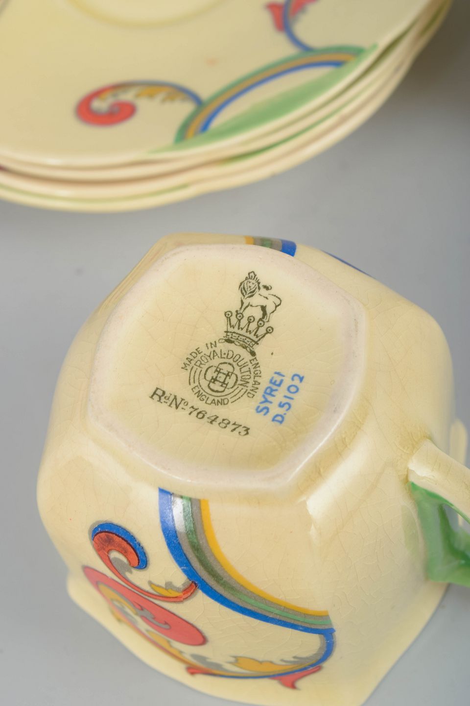 Clarice Cliff for Royal Doulton, sæt på 4 kaffekopper med underkopper.Art deco-kaffeservice i fajance med craqueléglasur og dekoration i “Syren”-serien. Kopperne har klassisk, let konisk form, og underkopperne er udført med harmonisk, rund fane, der fremhæver det tidstypiske udtryk.