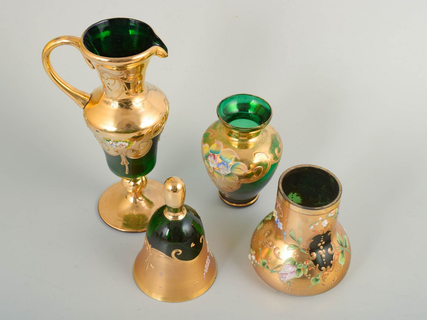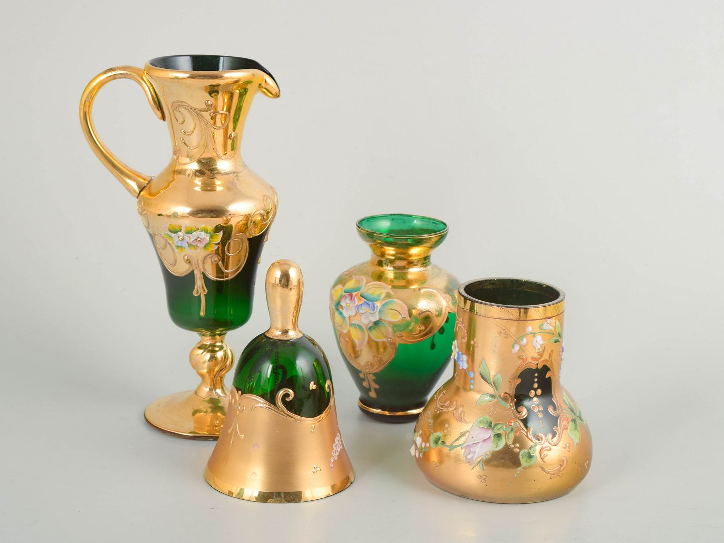 Bøhmisk glas, sæt med fire dele.Dekorativt sæt bestående af fire dele i grønt glas med rig guldfarvet dekoration og emaljemalede blomster. Sættet omfatter en lille kande, en klokkeformet del med knop, samt to vaser i varierende former. Håndlavet arbejde udført i Bøhmen, med tydelige variationer i form og proportioner.