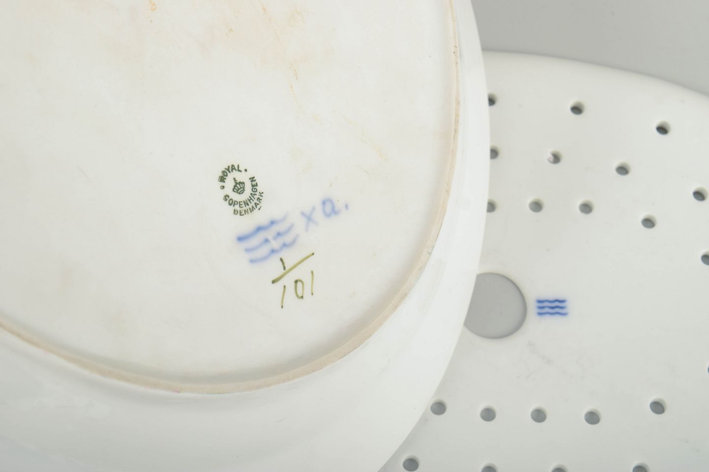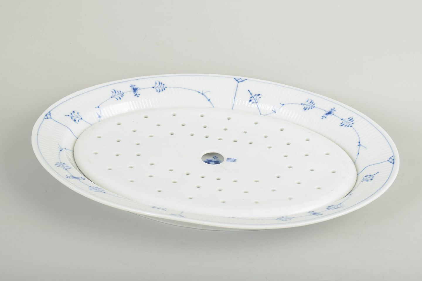 Royal Copenhagen, Musselmalet riflet fiskefad med tilhørende fiskerist.Fiskefad i porcelæn dekoreret i Musselmalet riflet med håndmalet underglasurblå blomster og ranker. Sættet består af en gennemhullet indsats og et tilhørende rundt fad, udført efter Royal Copenhagens model 1/101.