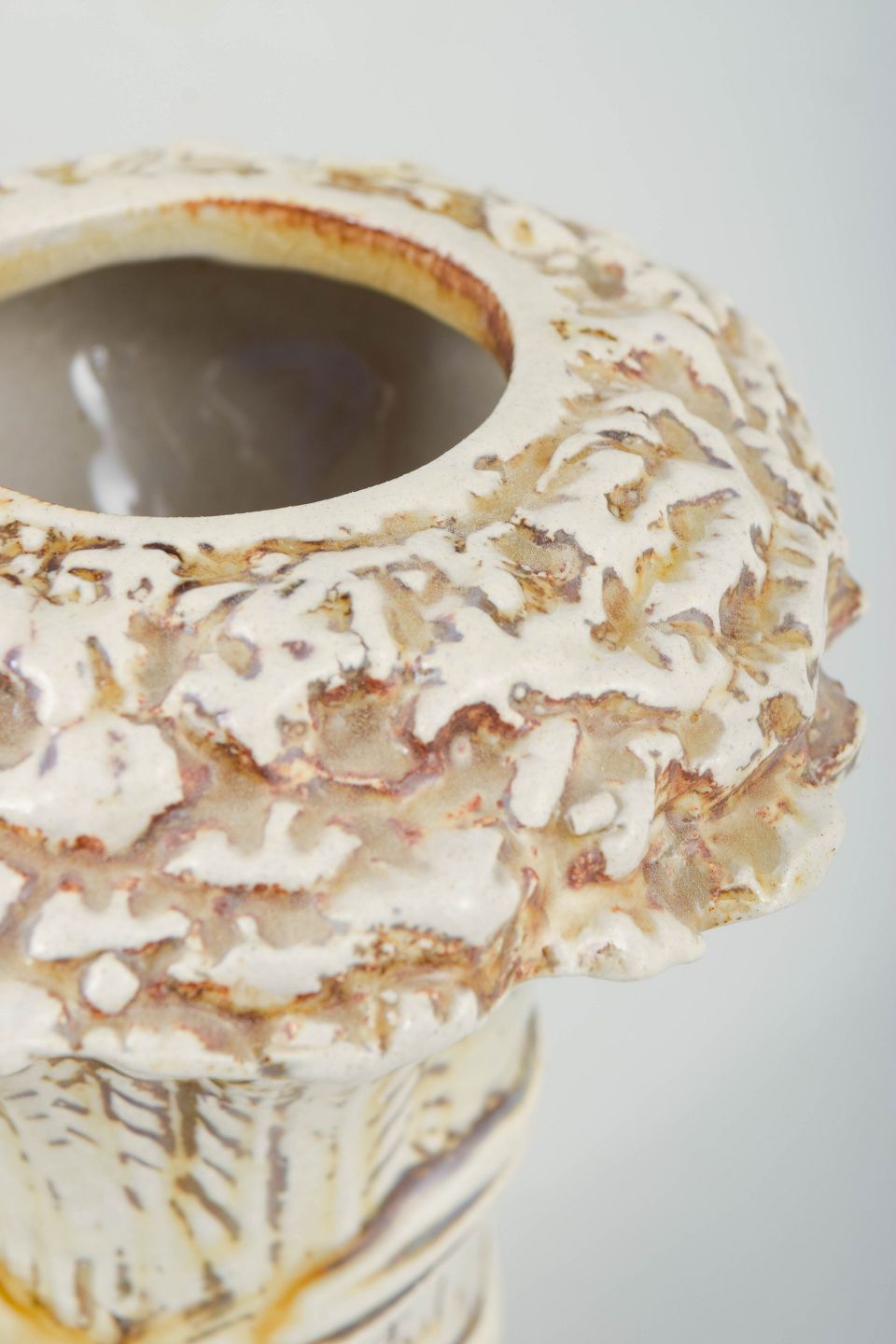 Höganäs, vase.Kraftfuldt formet vase i stentøj med markant reliefdekoration og kraftig, løbende glasur i cremefarvede og brune nuancer. Overfladen har et tydeligt, næsten barklignende udtryk, der understreger det skulpturelle formsprog. Signeret “KB” i bunden. Udført hos Höganäs Keramik og dateret til omkring 1960’erne.