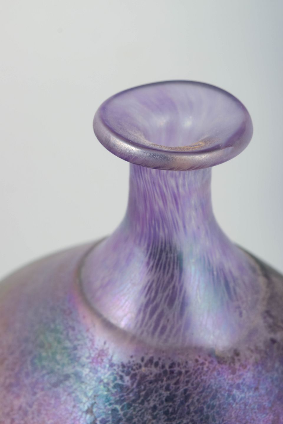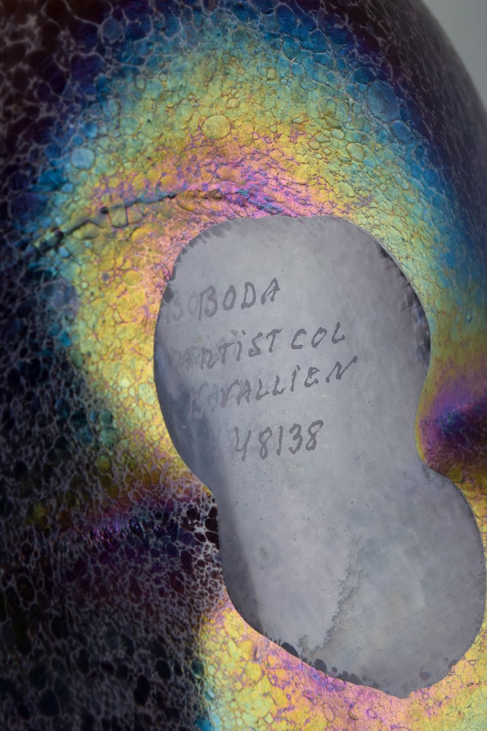 Bertil Vallien for Kosta Boda, vase.Skulpturel, balusterformet kunstglasvase udført i mundblæst glas med karakteristisk iriserende overflade i violette, blå og grønne nuancer. Overfladen har en levende, let krakeleret struktur, som giver dybde og farvespil. Modellen er udført efter Kosta Bodas model 48138 og er typisk for Bertil Valliens eksperimenterende formsprog i 1980’erne.