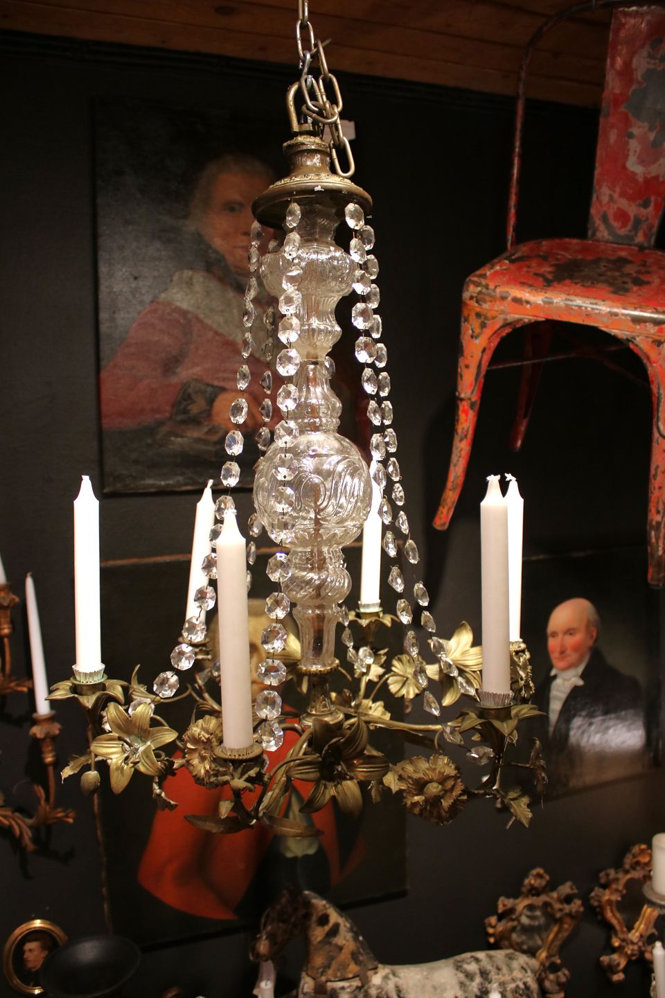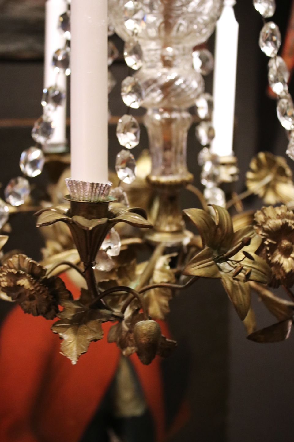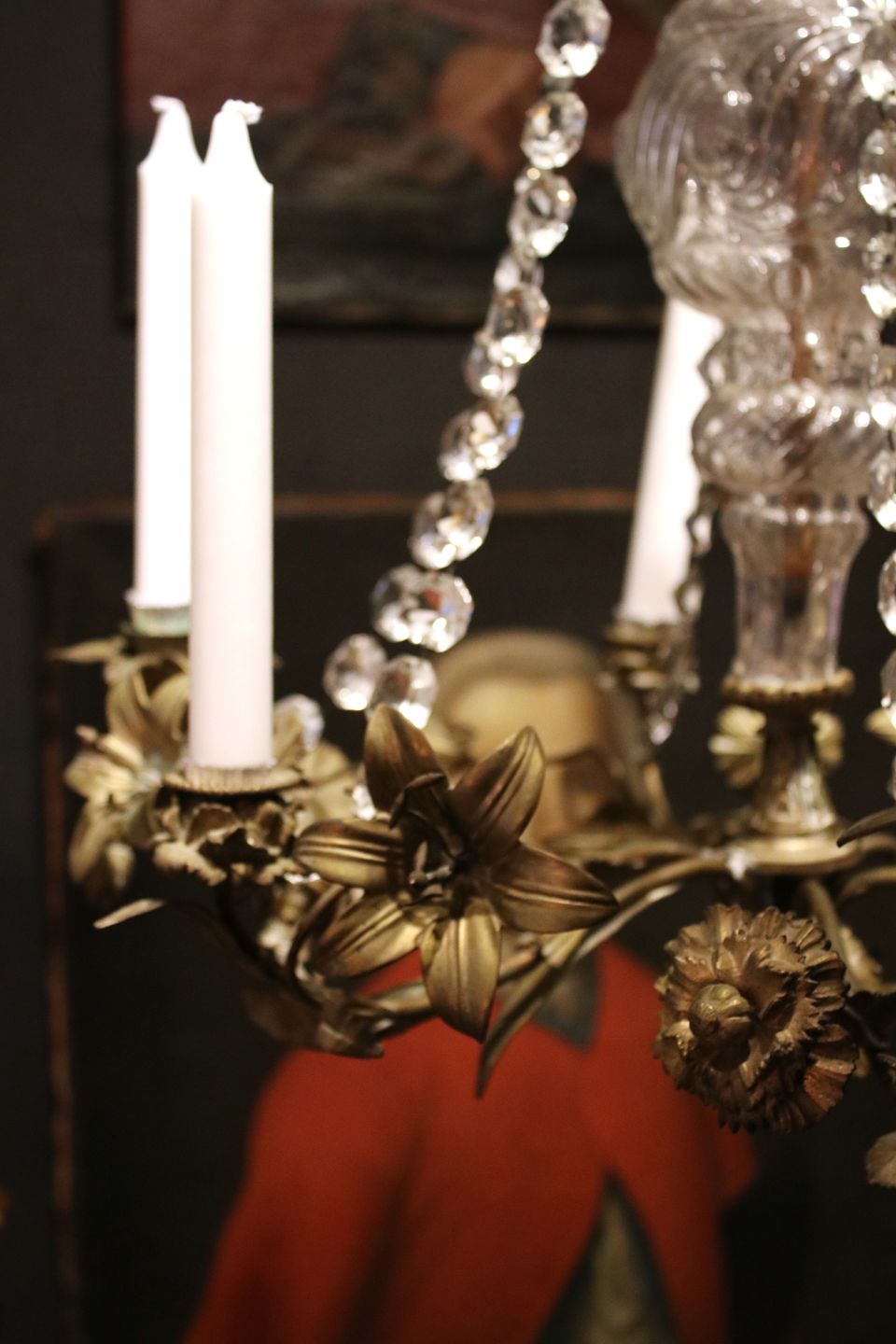 Antik , fransk lysekrone i bronze til stearinlys (6 stk.)dekoreret med fine bronze blomster , prisme kæder og glasrør.