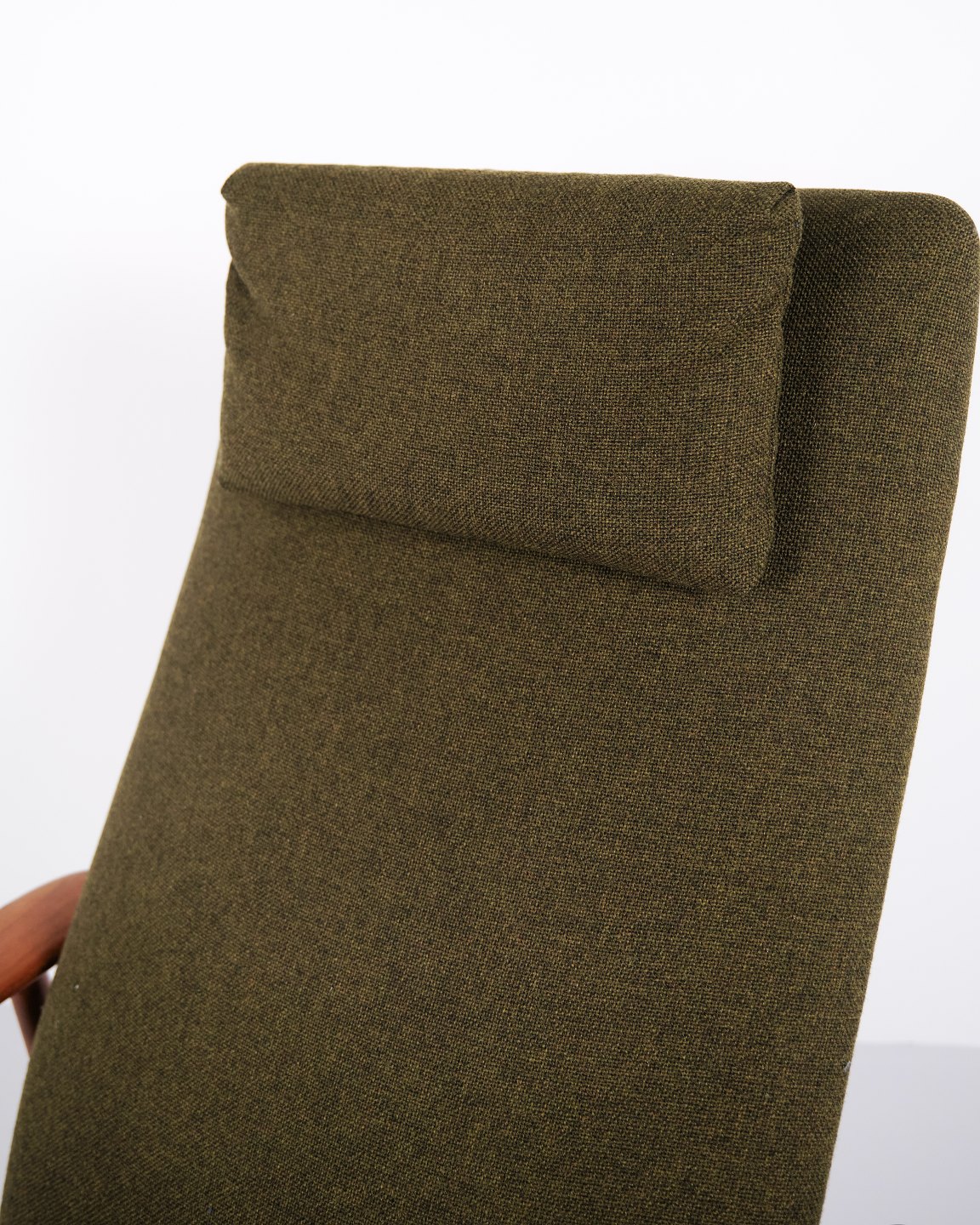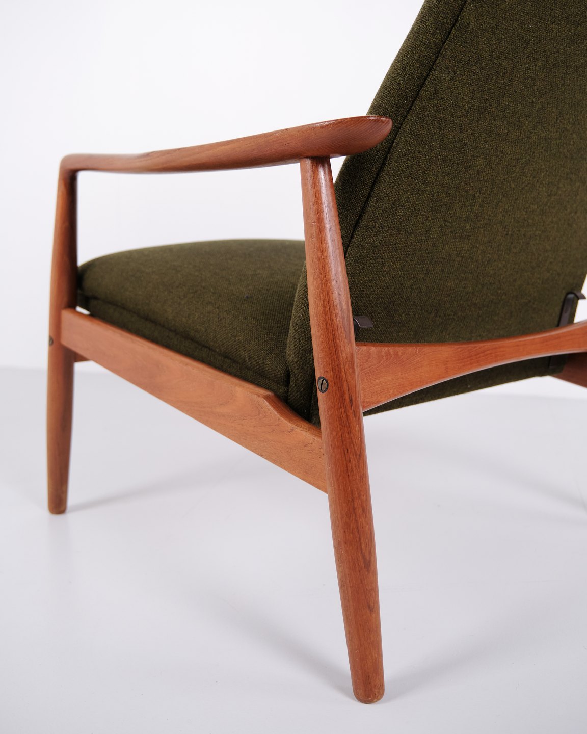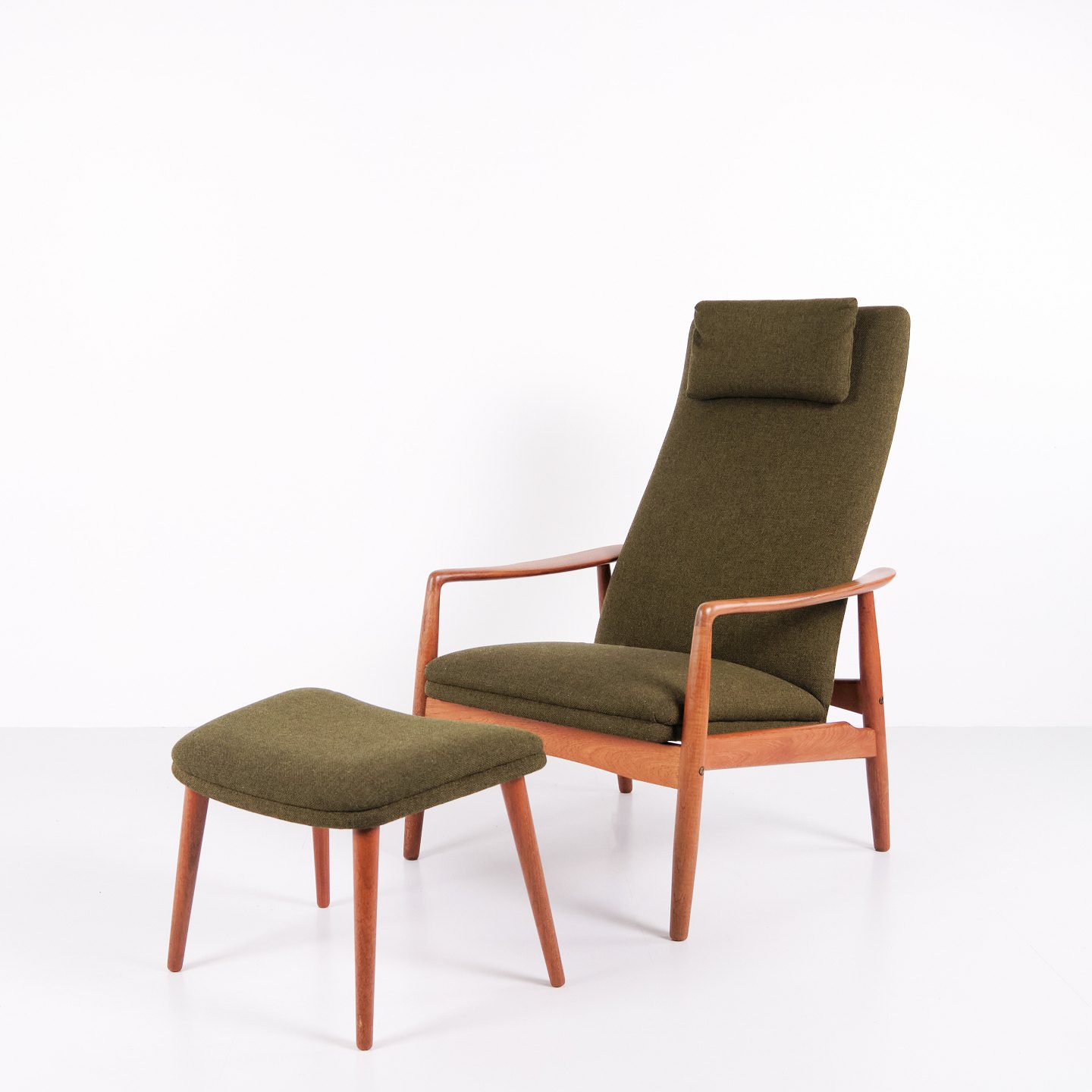 Et par hvilestole med skammel designet af Alf Svensson for Fritz Hansen. Teaktræ og grønt stof. Skandinavisk design fra 1960’erne med fokus på komfort.— Oprindelse: Danmark