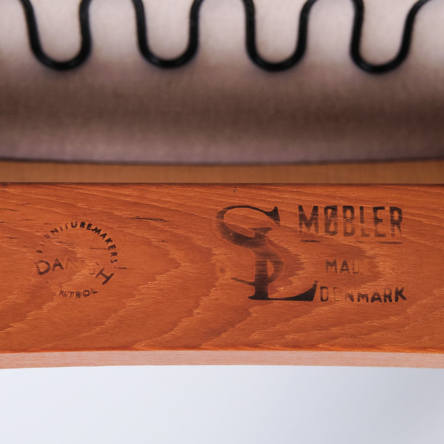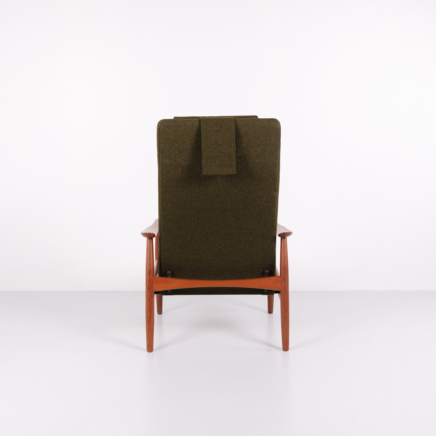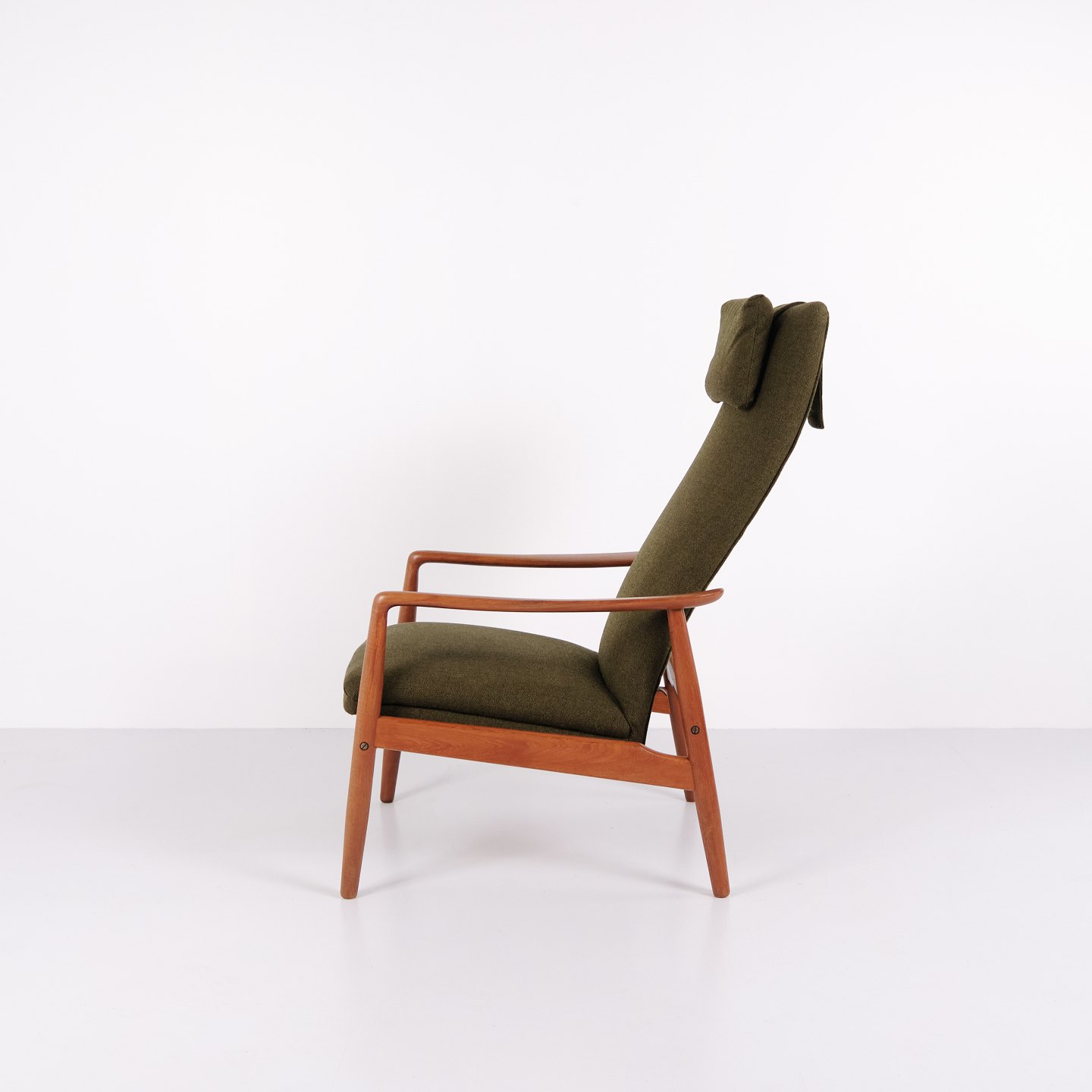 Et par hvilestole med skammel designet af Alf Svensson for Fritz Hansen. Teaktræ og grønt stof. Skandinavisk design fra 1960’erne med fokus på komfort.— Oprindelse: Danmark