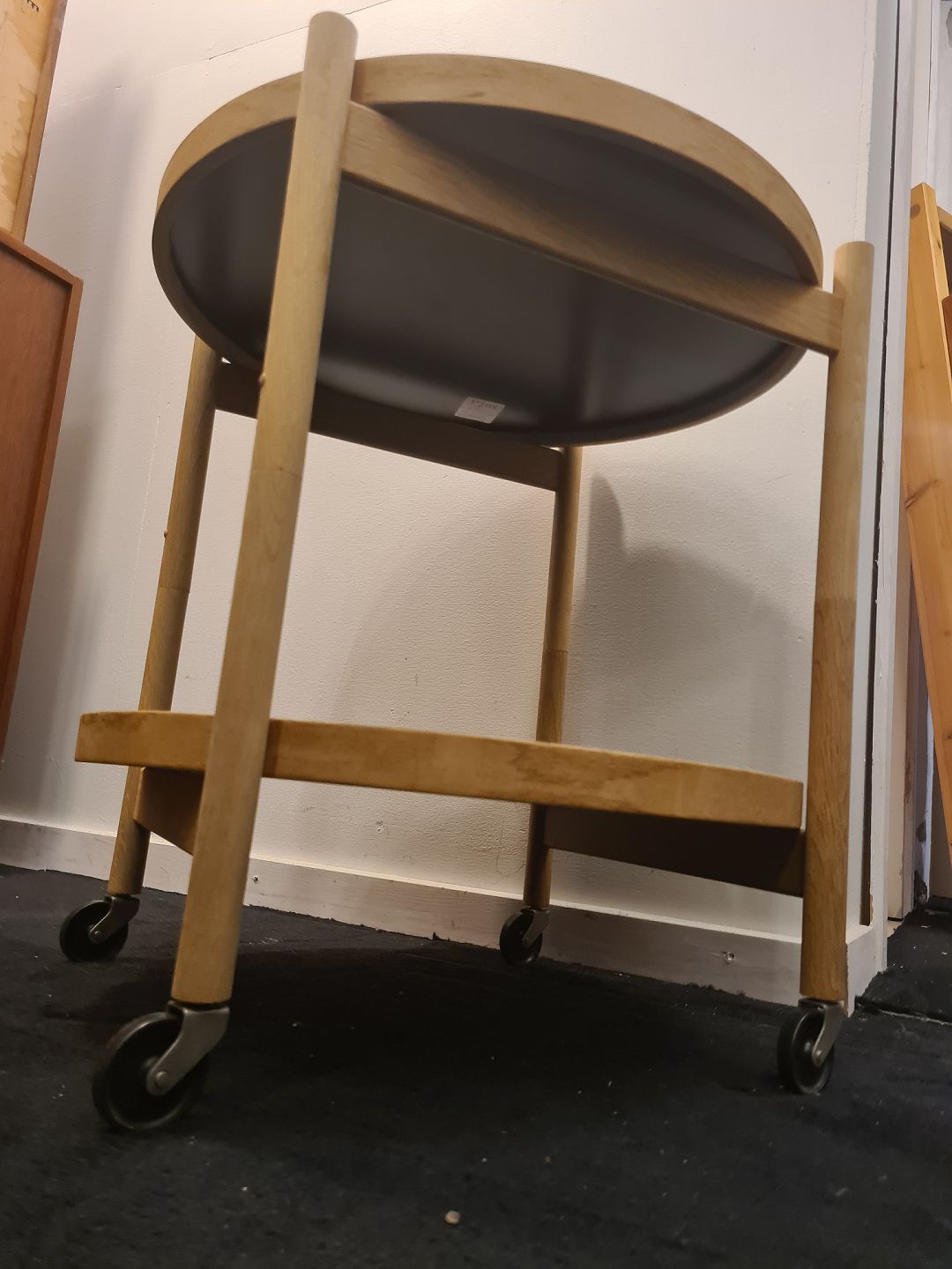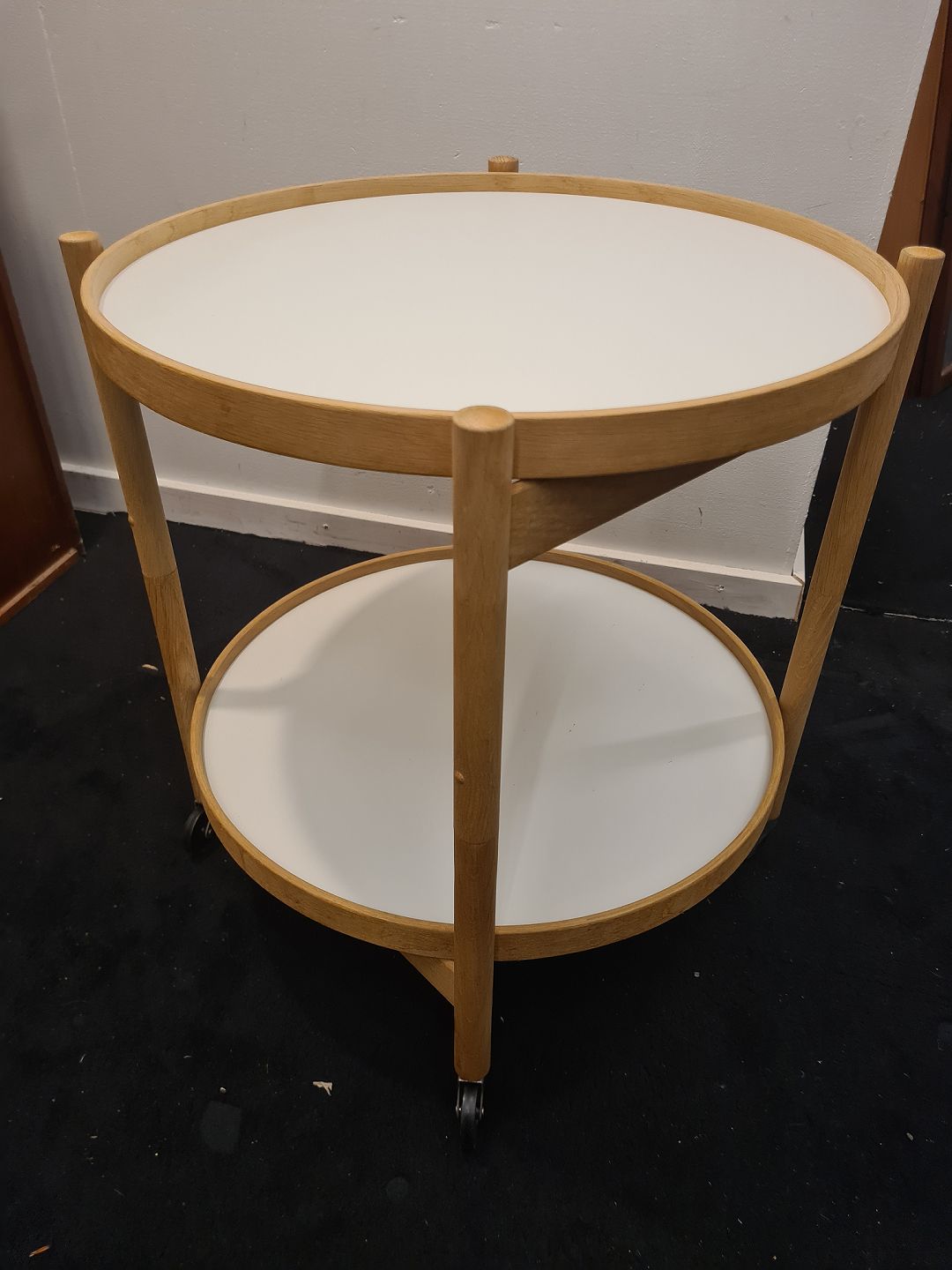 Bakkebord designet af Hans Bølling her i elm med sort/hvid bakker. Fremstår pænt og velholdt uden nævneværdige brugsspor.Højde 55 cm. Diameter 50 cm.