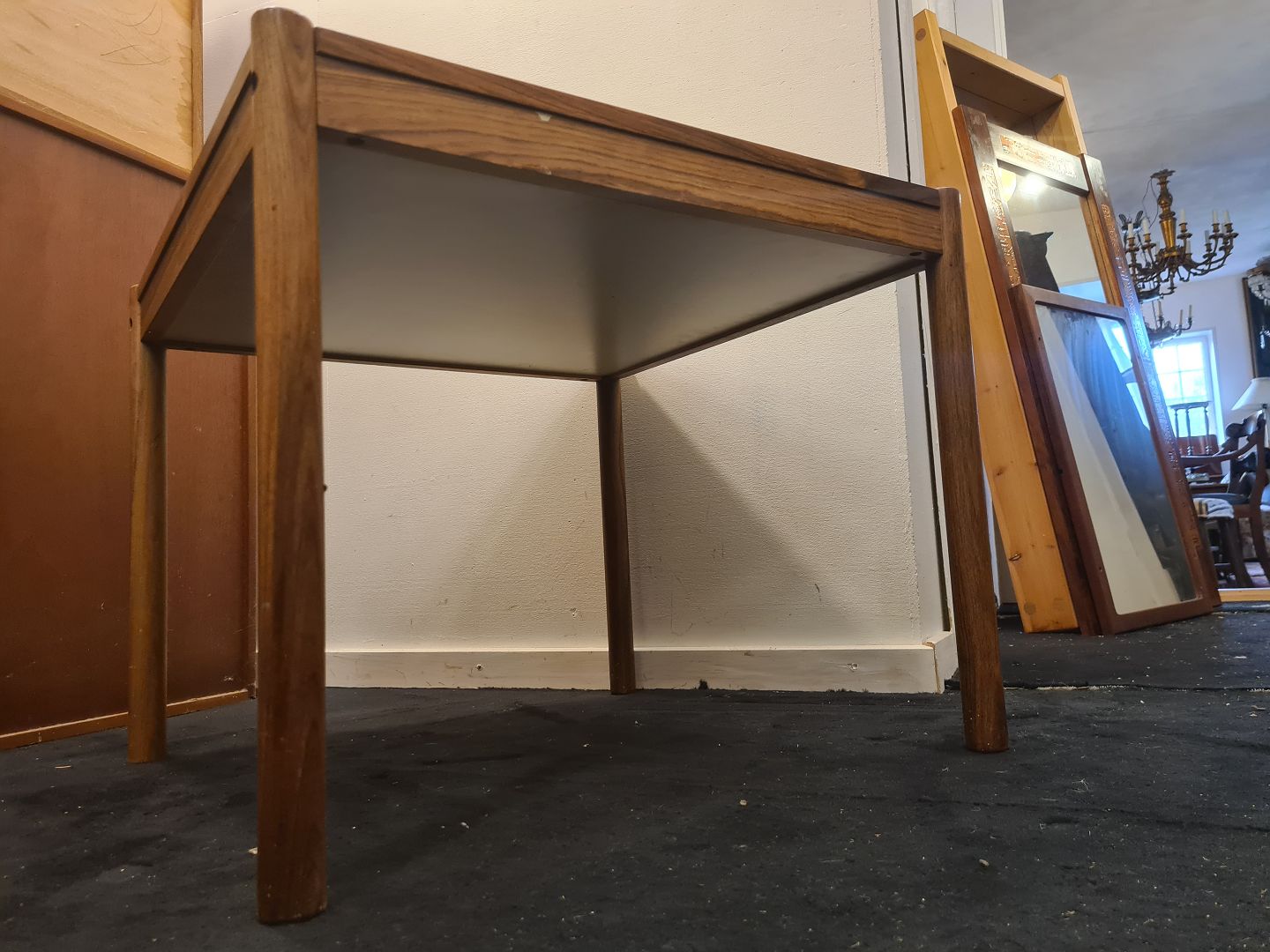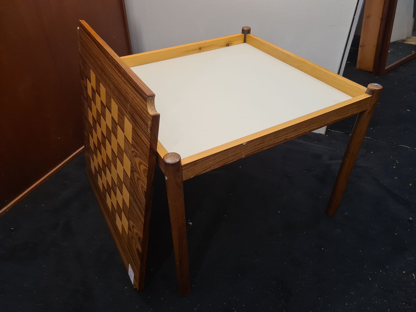 Kvadratisk skakbord i palisander fremstillet hos Georg Petersens møbelfabrik i 1970'erne. Fremstår pænt, velholdt og udmærket funktionsdygtigt.Højde 49 cm. Længde 60 cm. Bredde 60 cm.