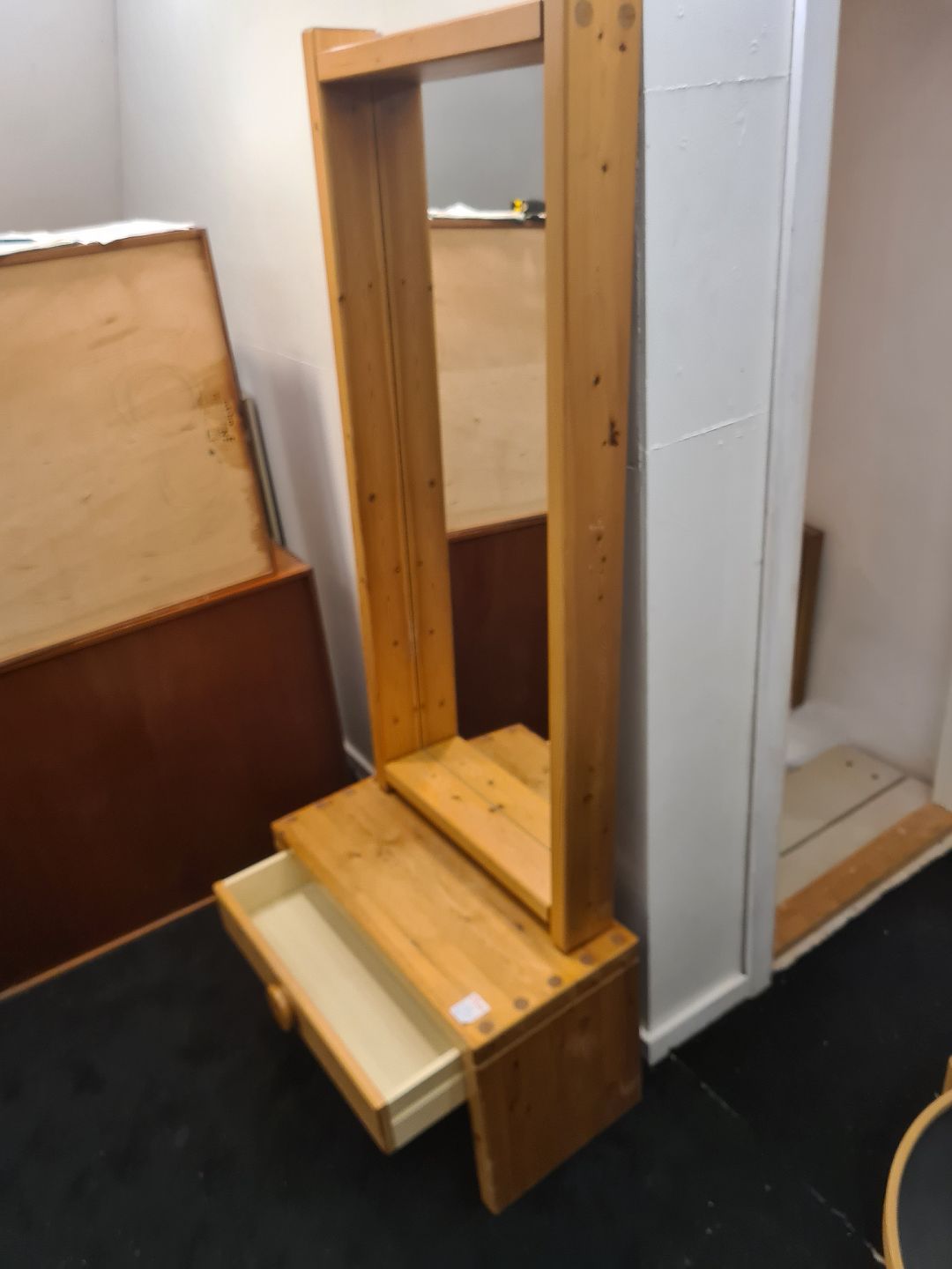 Svensk produceret entré møblement bestående af kommode og spejl. Fremstillet i massiv fyr i 1980'erne. Fremstår godt og ok velholdt dog med lidt overfladiske brugsspor.Spejl dimensioner: Højde 133 cm. Bredde 61 cm. Dybde 11 cm.