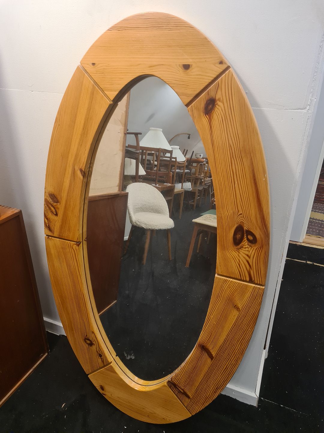 Svensk designet ovalt spejl i massiv fyr. Fremstillet i 1980'erne. Fremstår pænt og velholdt uden nævneværdige brugsspor.Højde 140 cm. Bredde 80 cm. Dybde 4 cm.