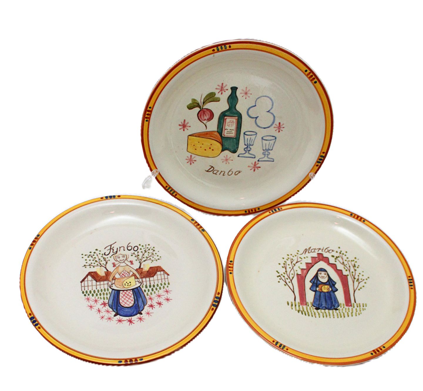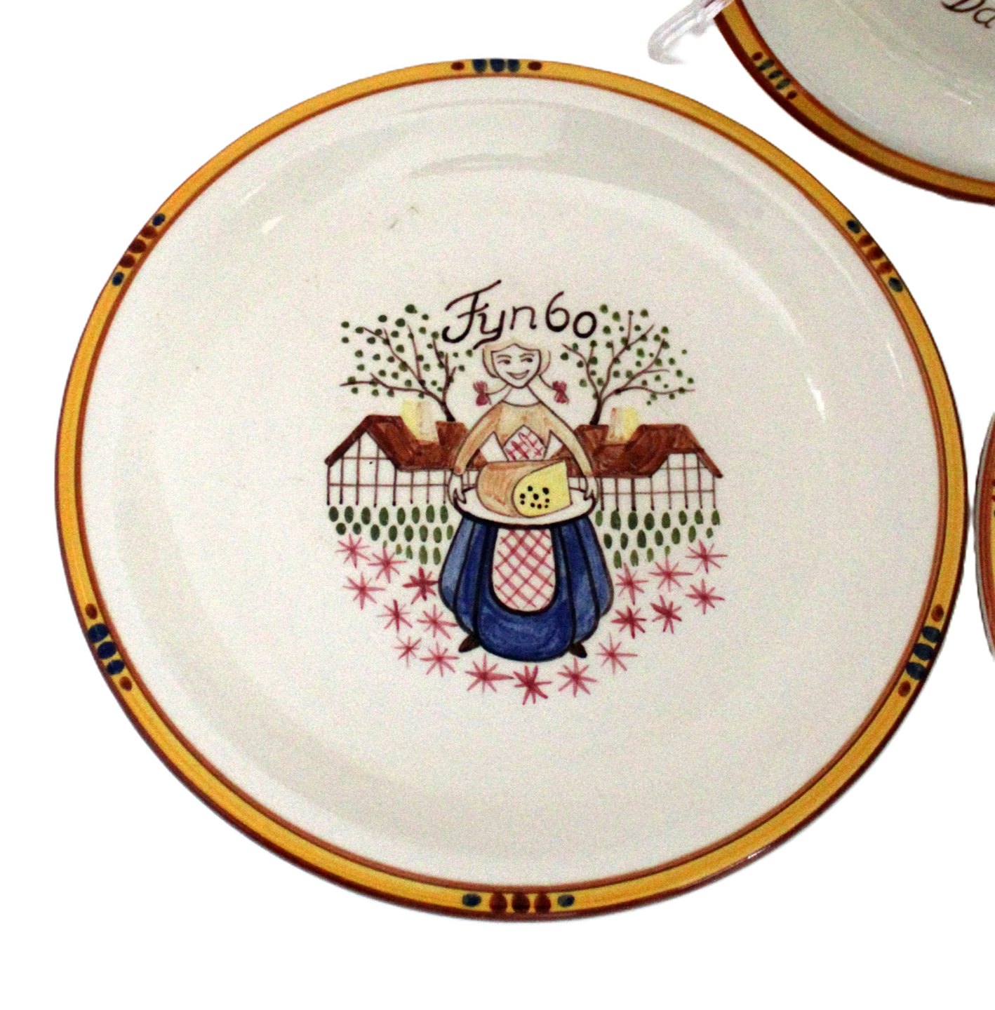 Knabstrup, Ostestellet. Formgivet af Johannes Hansen i 1959 og dekoreret af Paul Høyrup. Motiv og navn for de forskellige danske ostetyper, Fynbo, Molbo, Danbo, Maribo, Esrum og Samsø.Ostetallerken. Nr. 205. Diameter 22 cm. Fin stand med let brugsslid. Pris: 175 kr. stk.