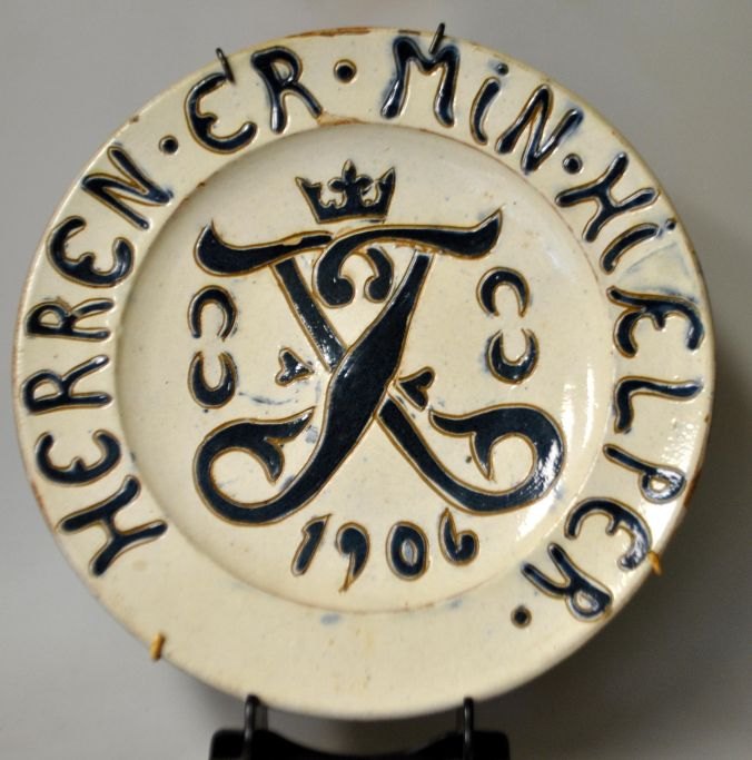 Dansk keramiker (1906): Mindeplatte for Frederik VIIIs tronbestigelse, 1906. Med blå og hvid glasur. Med Frederik VIII monogram og valgsprog: Herren er min hjælper. Dia: 28 cm.NB: Virkelig sjældenhed!