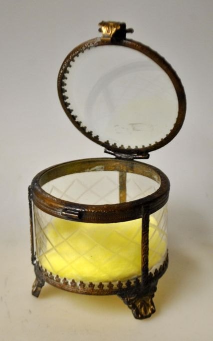 Smykkeskrin, Frankrig ca. 1900. Med facetteret glas og dekoreret messing ramme og tre ben. H.: 8 cm. Dia.: 8 cm.Emne nummer: 28770