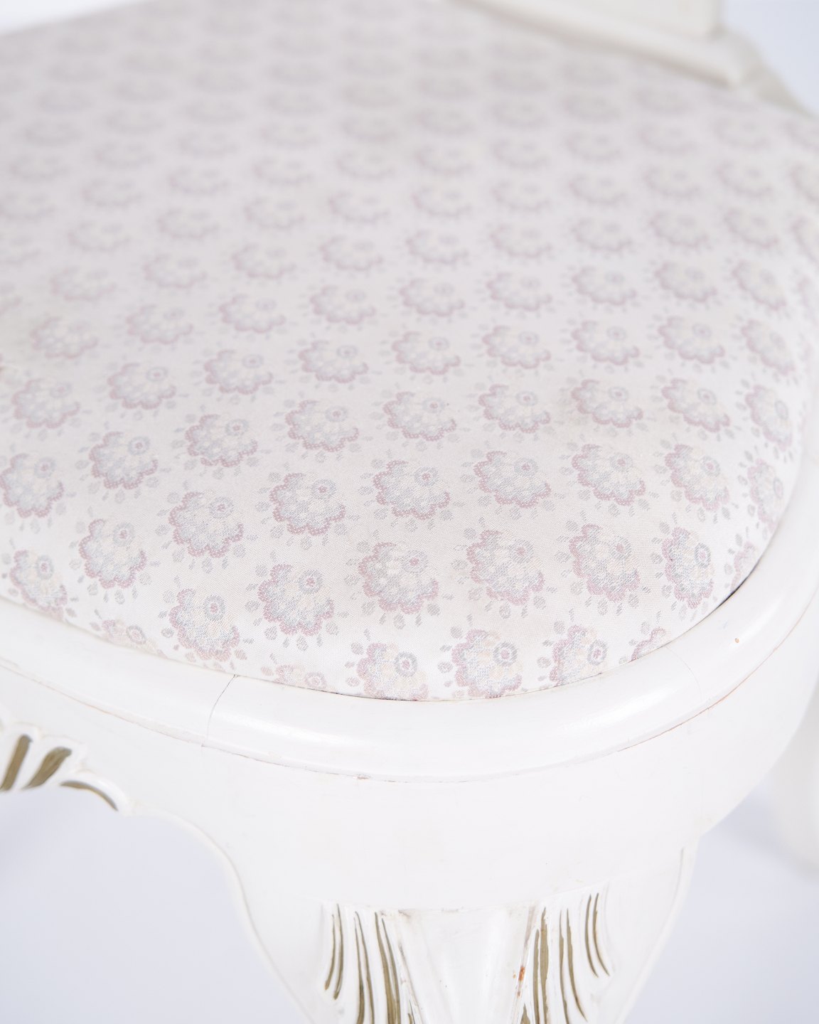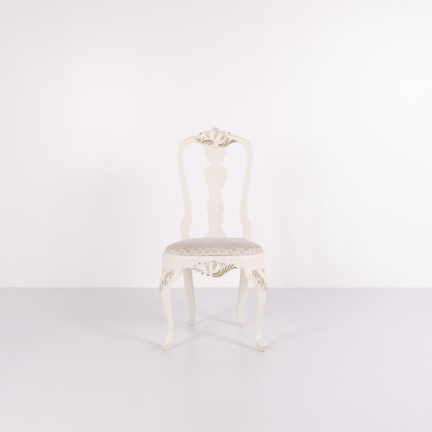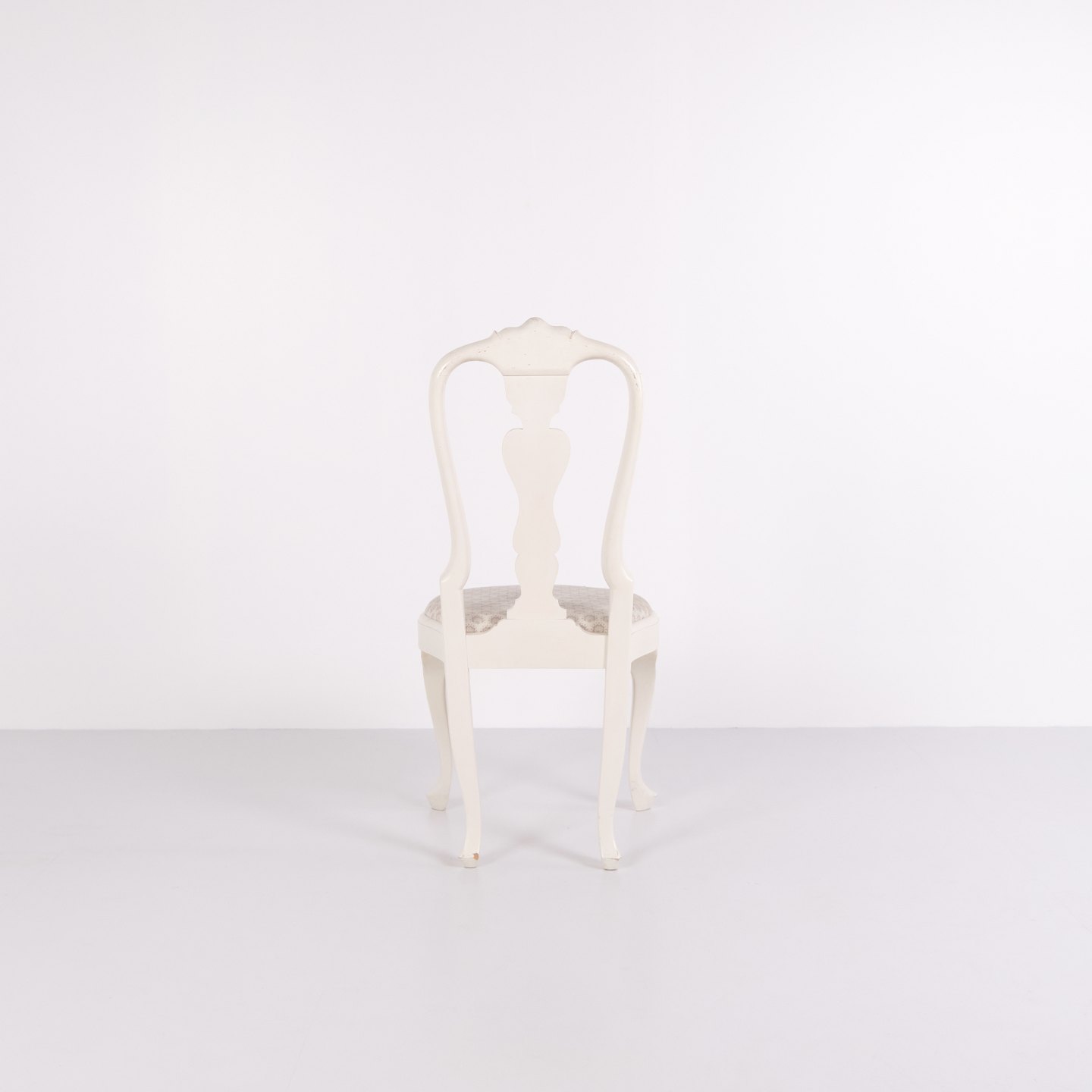 Antikke spisebordsstole i ny rokoko stil fra 1920’erne. Sæt af 6 hvidmalede stole med dekorative detaljer.— Stil: Ny rokoko