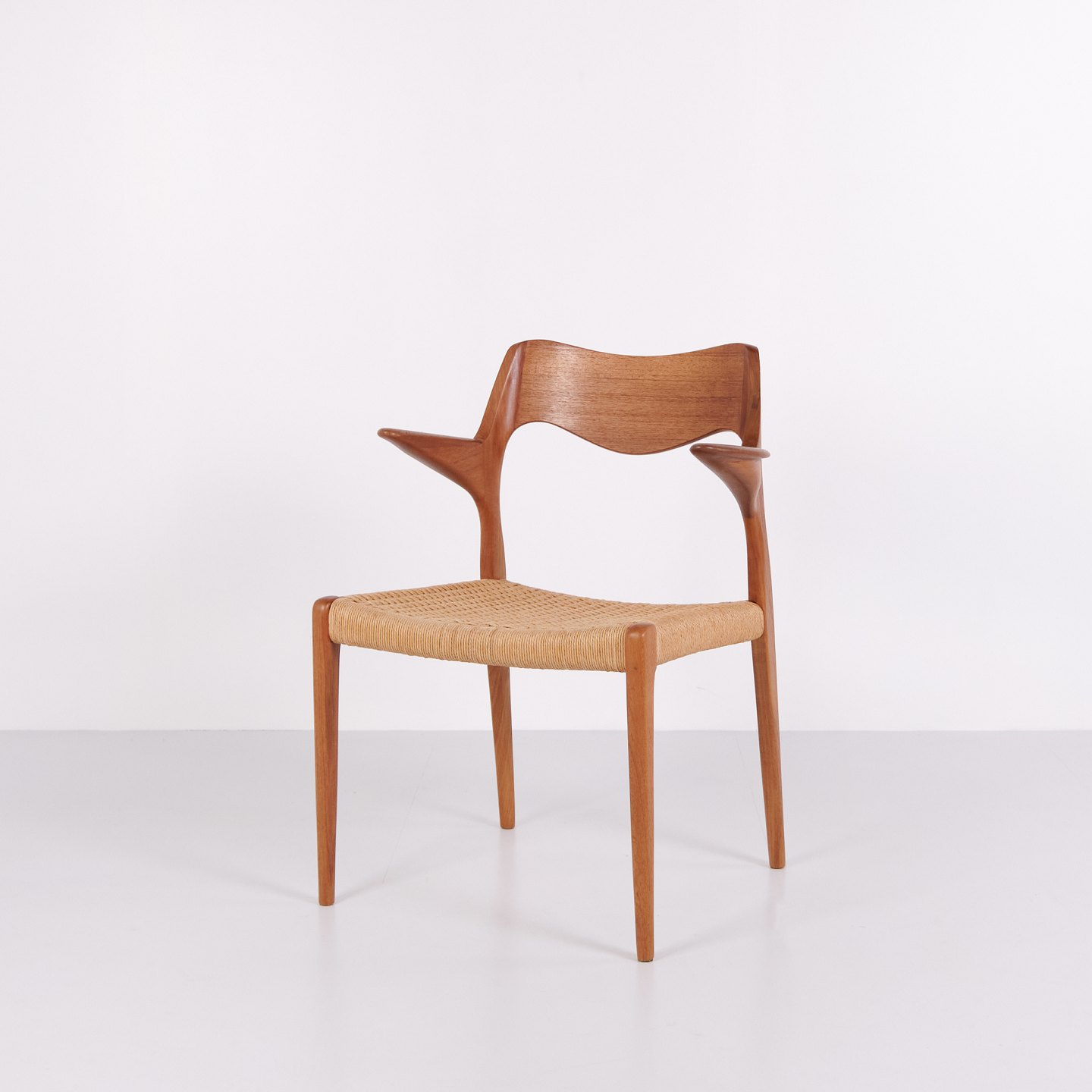 Model 55 spisebordsstol af N.O. Møller for J.L. Møllers Møbelfabrik i teak og flet fra 1960’erne. Dansk design klassiker.— Designer: N.O. Møller