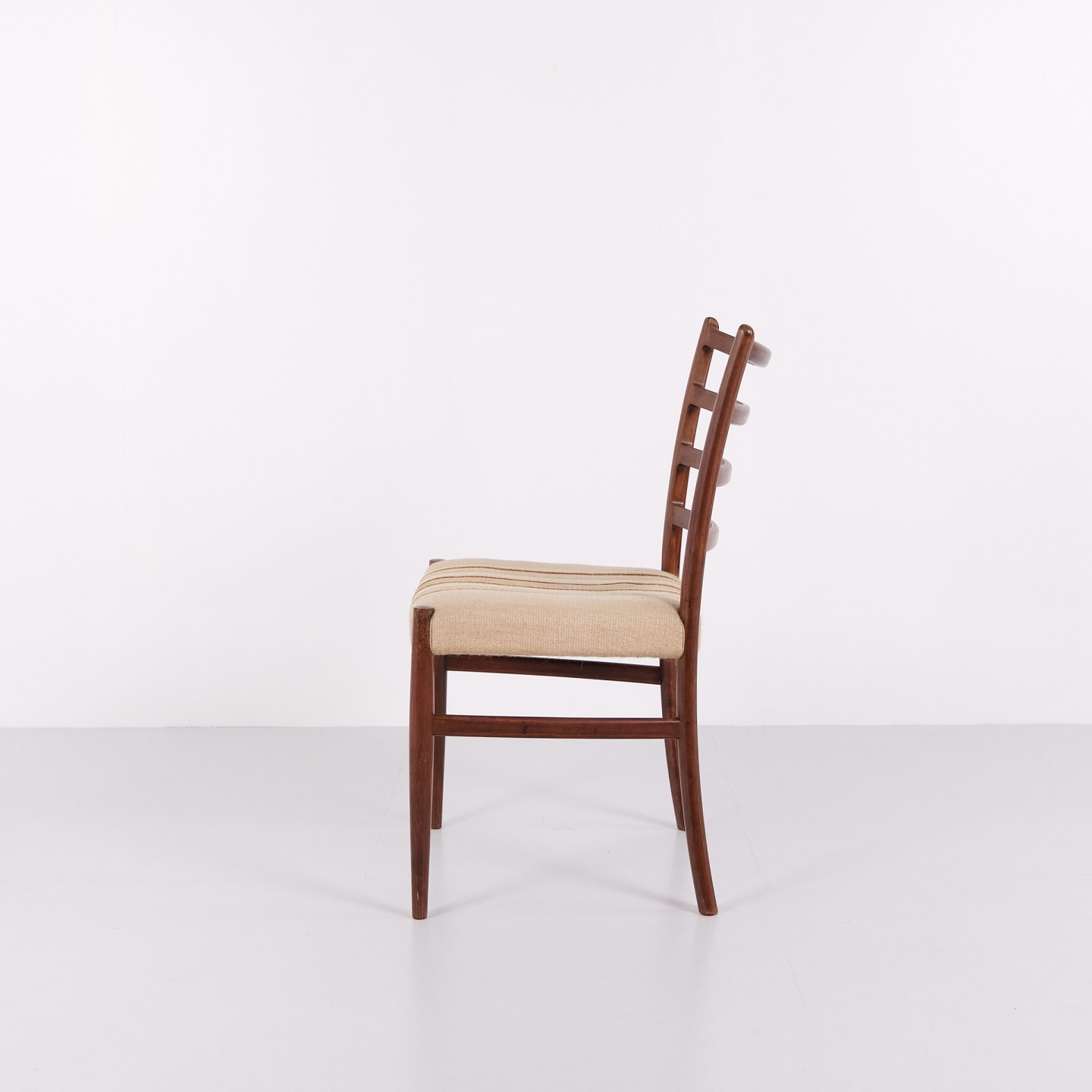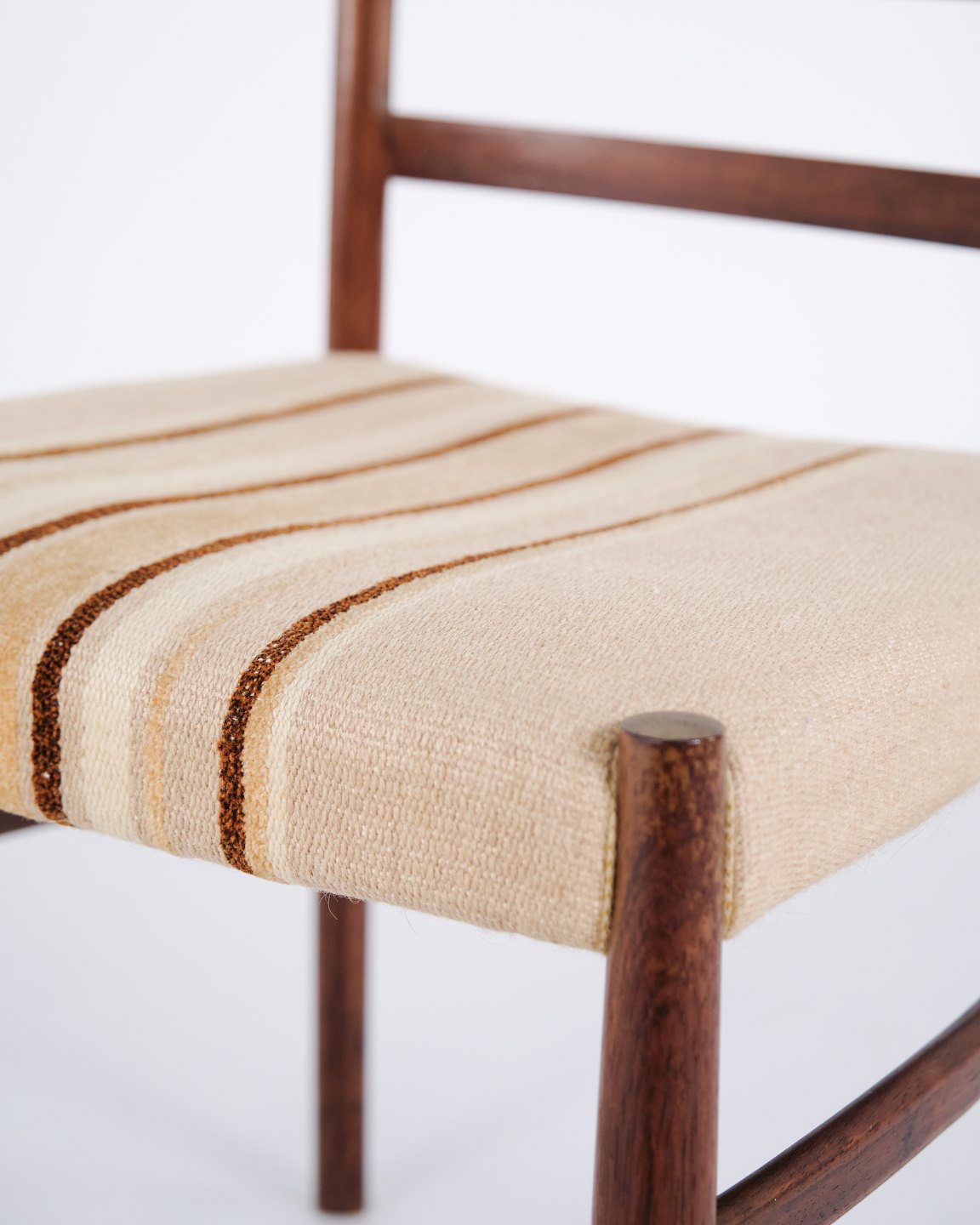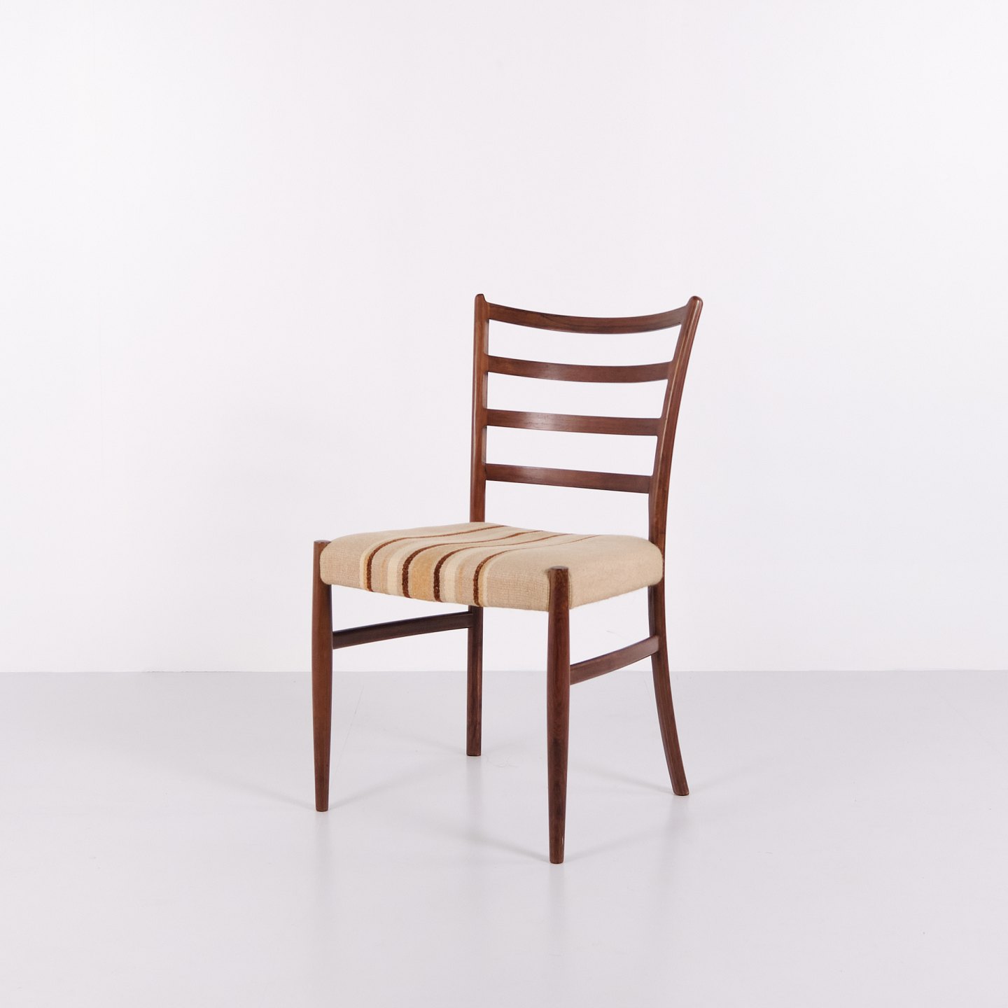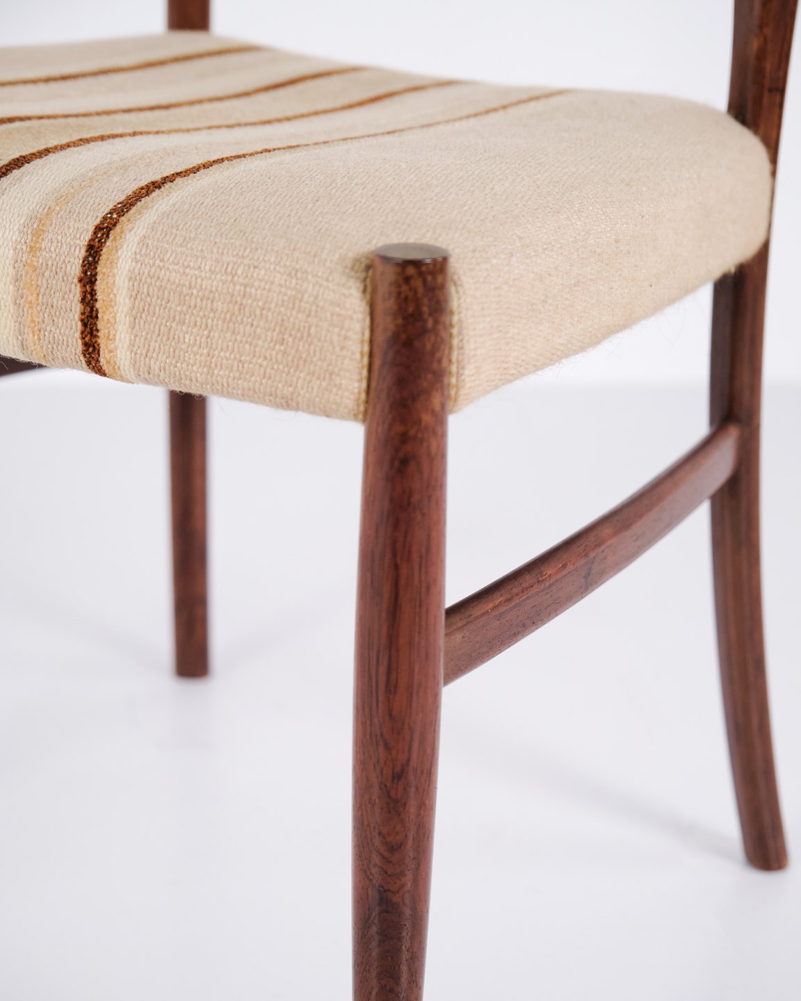 N.O. Møller spisebordsstole i palisander med stribet polster fra 1960’erne. Design af J.L. Møllers Møbelfabrik.— Designer: N.O. Møller