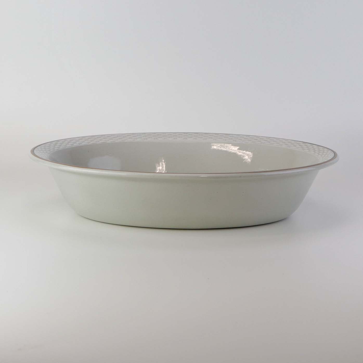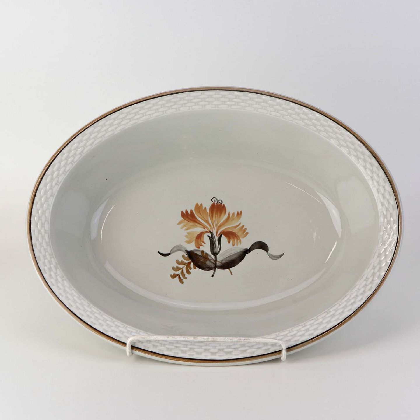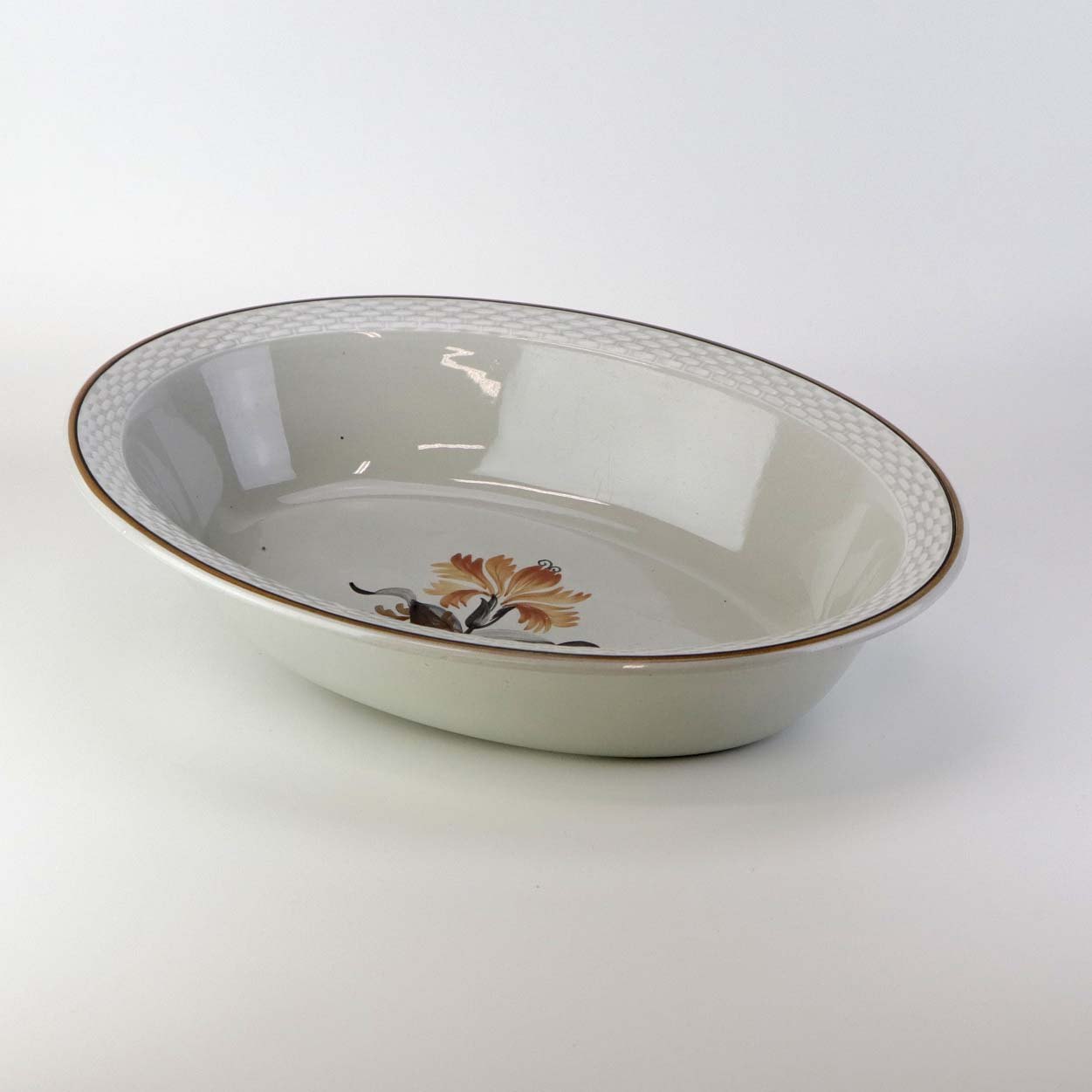 Oval serveringsskål i fajance fra stellet Kirsten, som blev fremstillet i perioden 1934-1957. Nr. 263Fomgiver Nils Thorsson