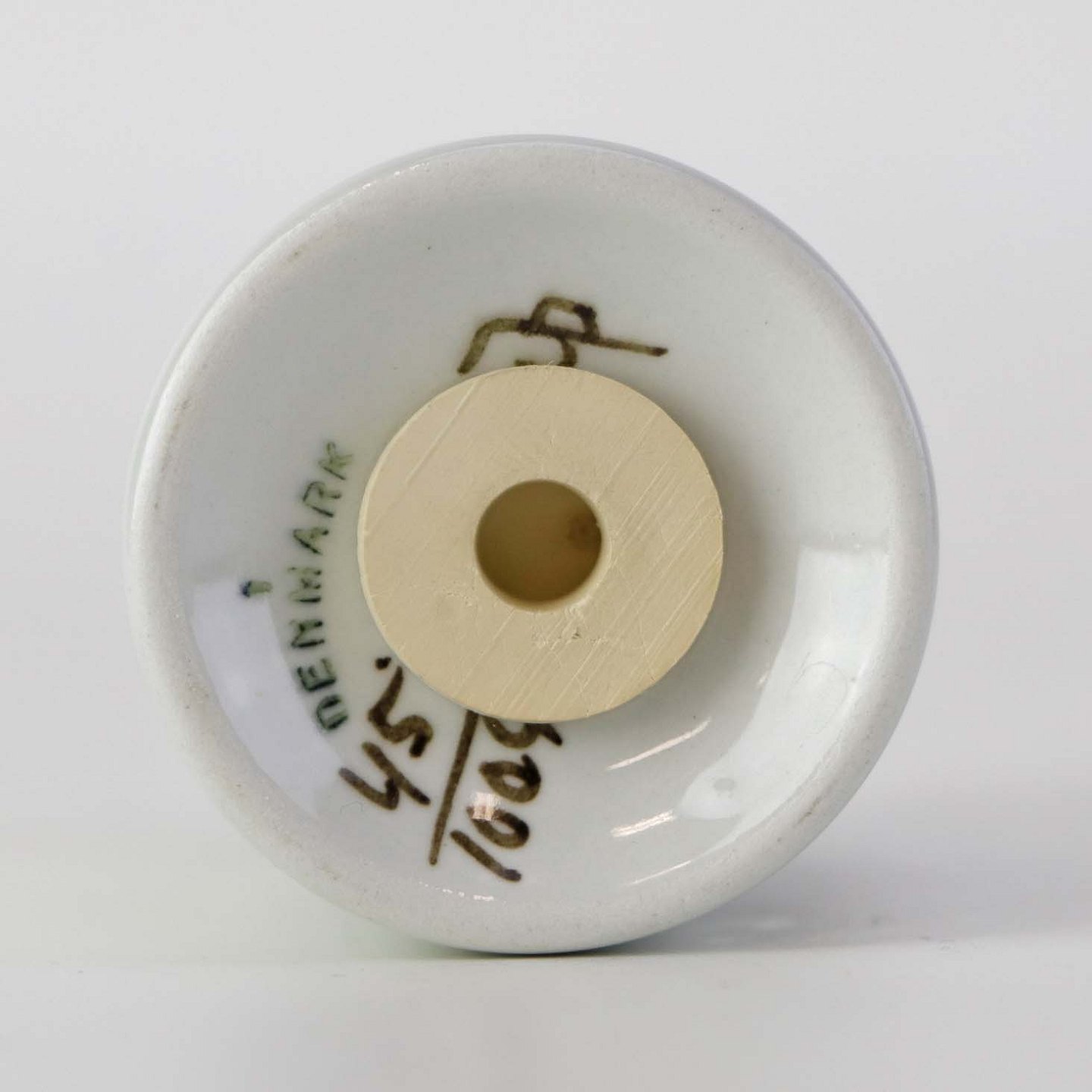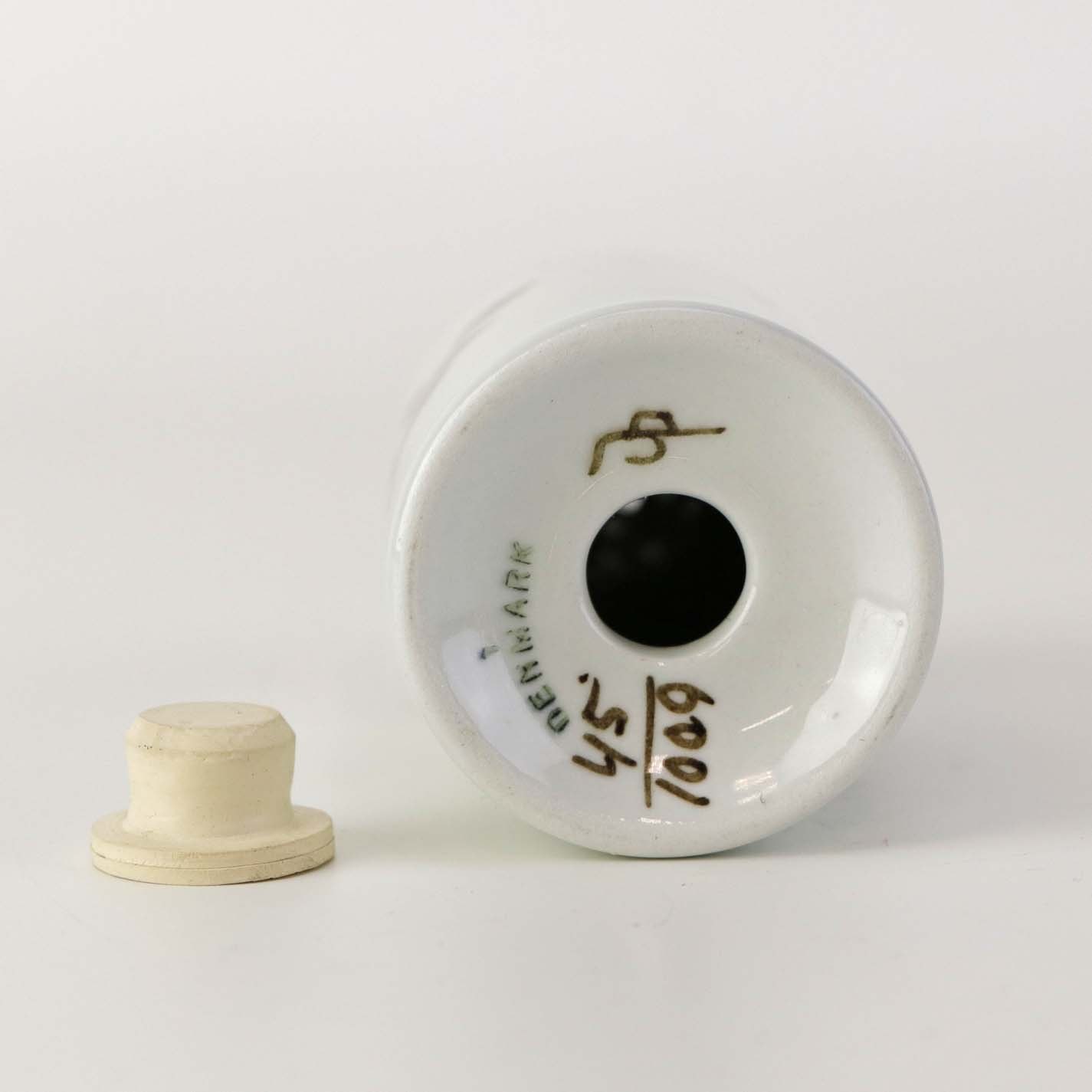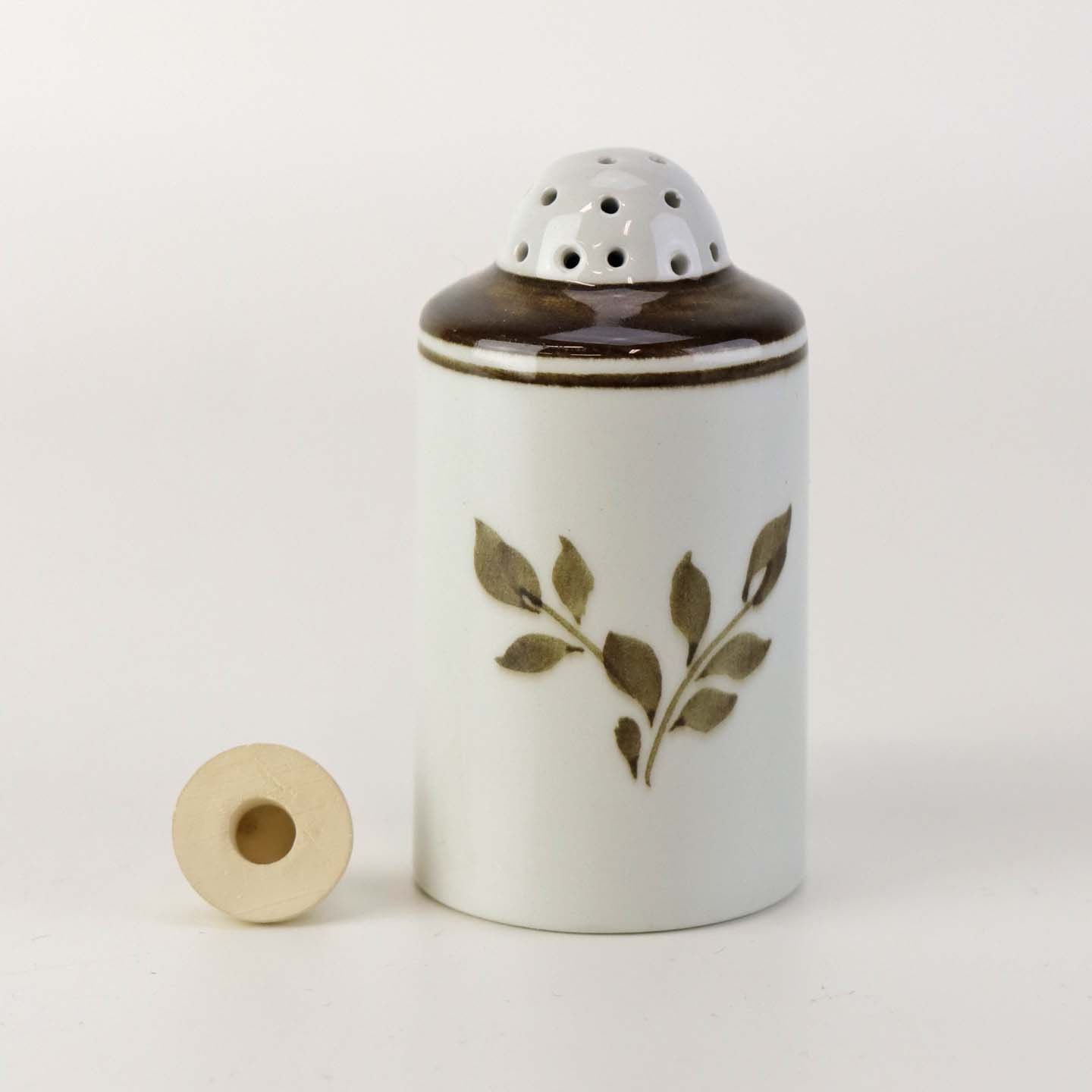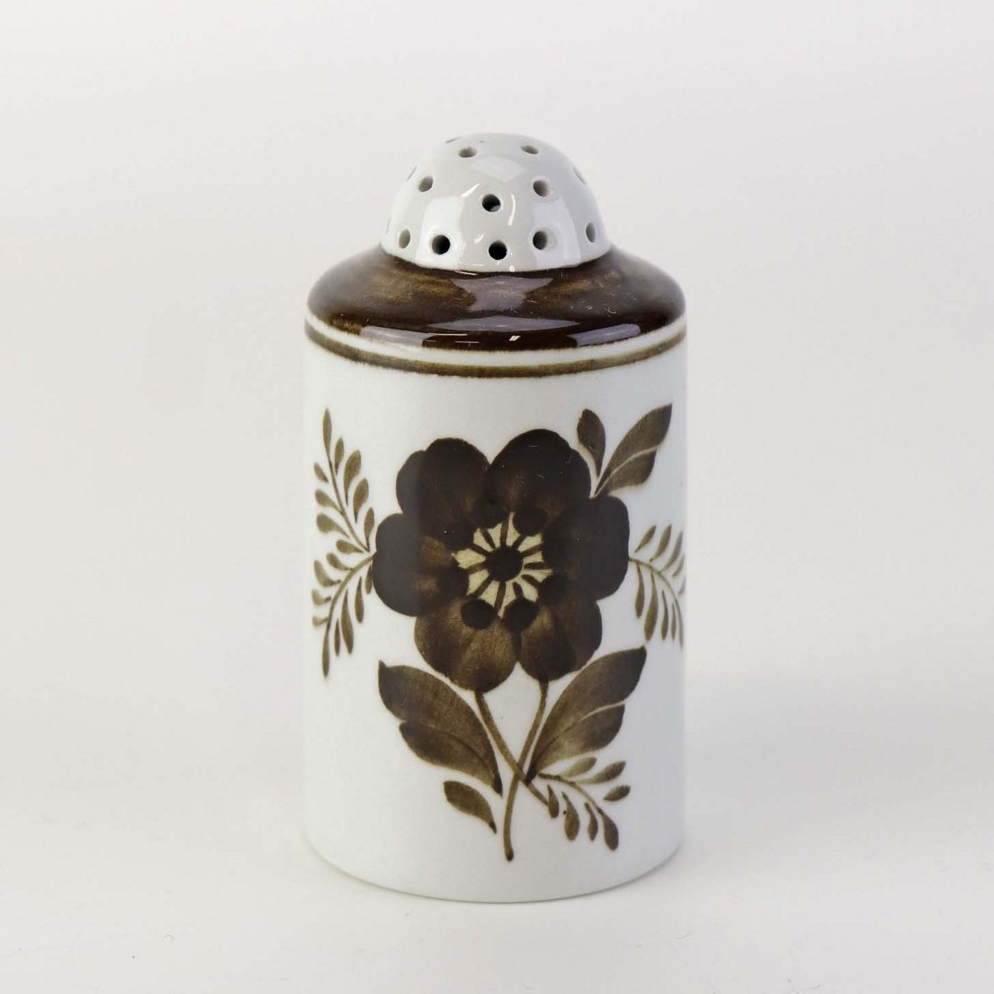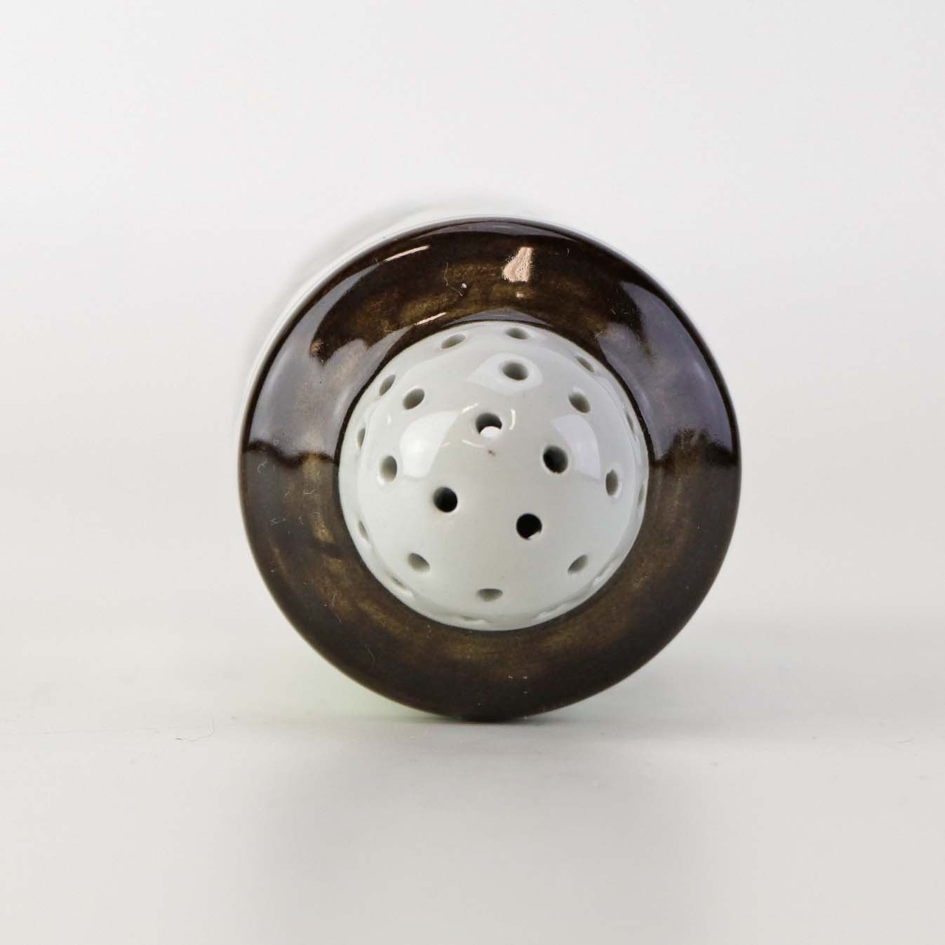 Peberbøsse i fajance fra stellet Brun Tranquebar fra år 1919. Nr 45/1009Fomgiver Chr. Joachim