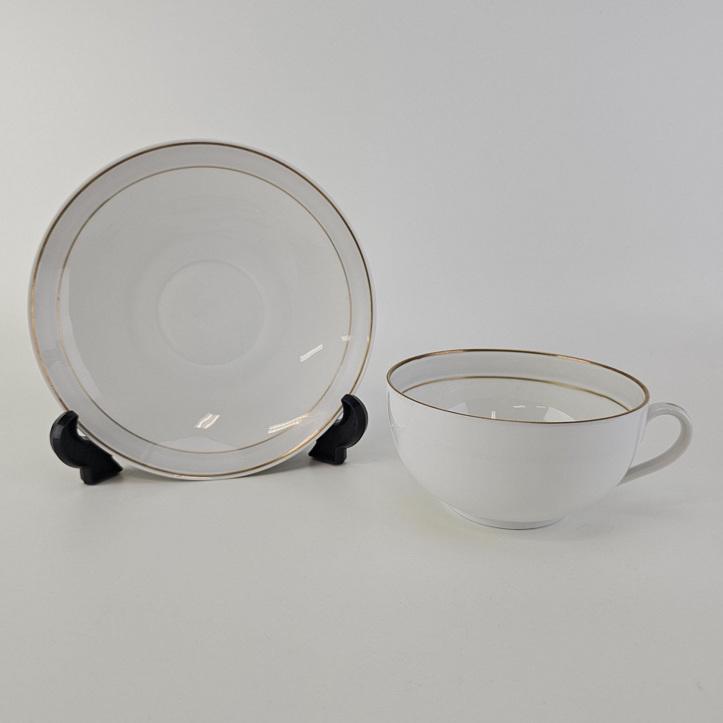 Tiber er stel i glat hvidt porcelæn med grå bort og guldkant