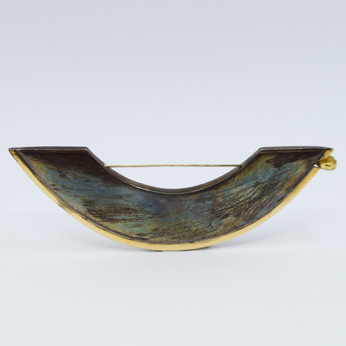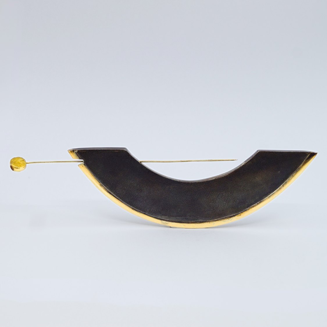 Anette Kræn; Stor kraftig sølv broche med oxideret overflade og 14 kt. guld. Kan vendes på to forskellige måder, med hver sit udtryk.L. 12,5 cm. H. 4 cm.