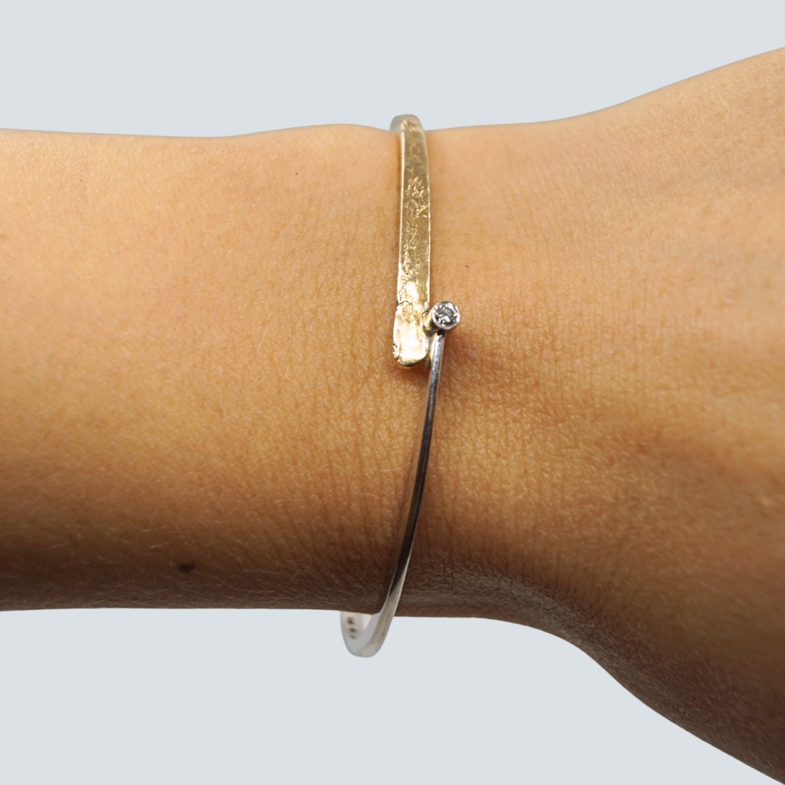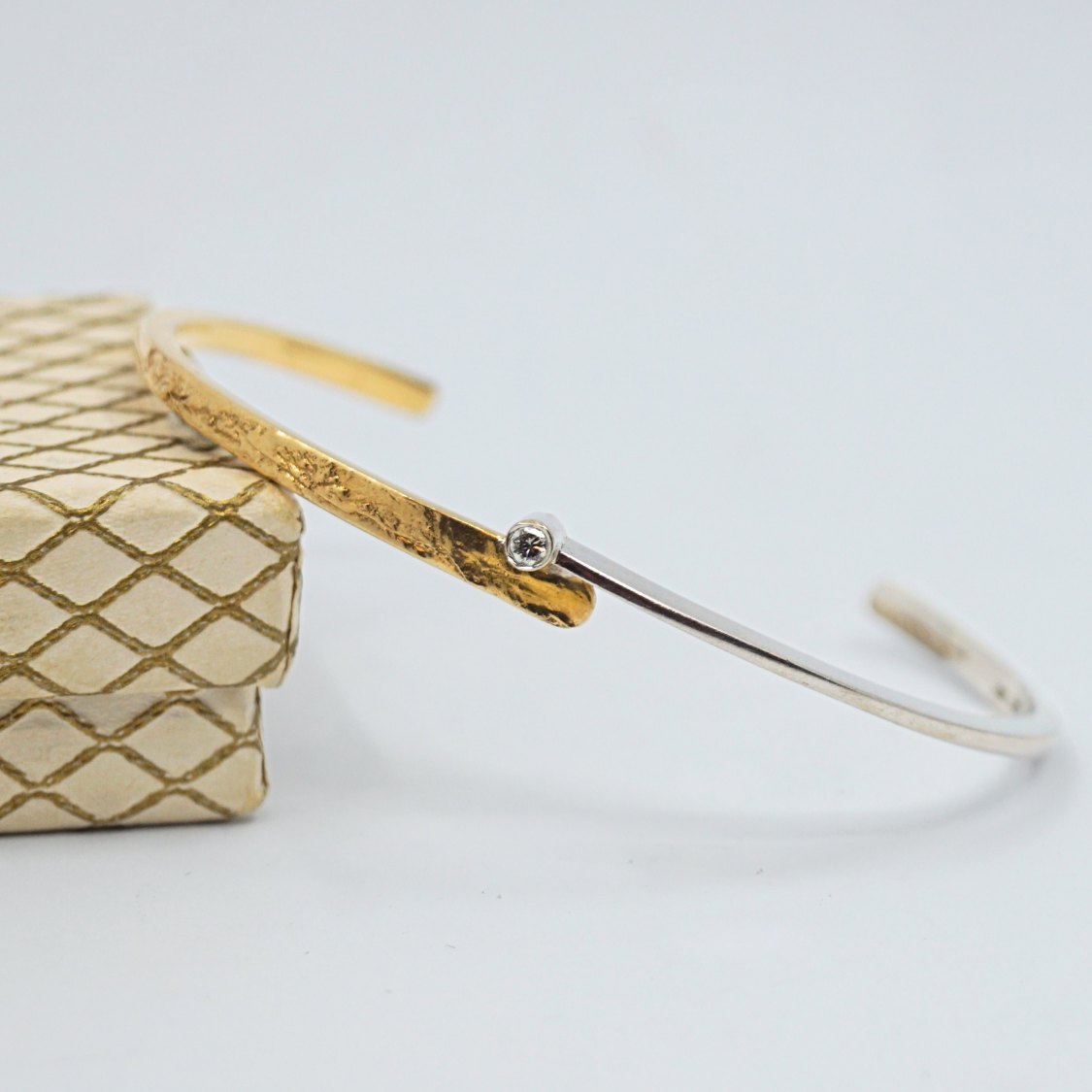 Guldarmring i 14 kt. hvidguld og guld, prydet med diamant i midten. Indvendige mål 5,6 cm x 5 cm. Designet med både glat og materet overflade i guldet.Stemplet "585".