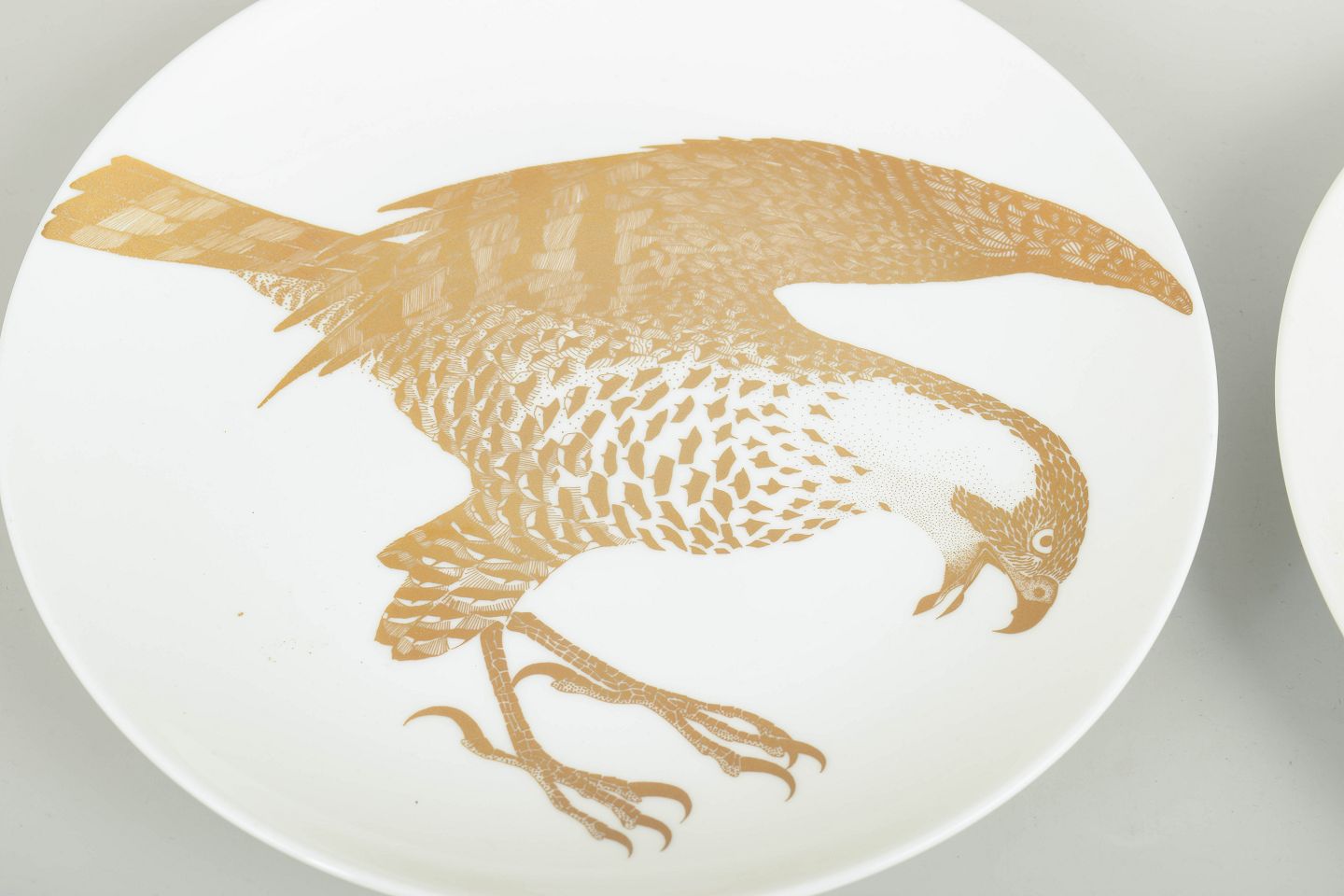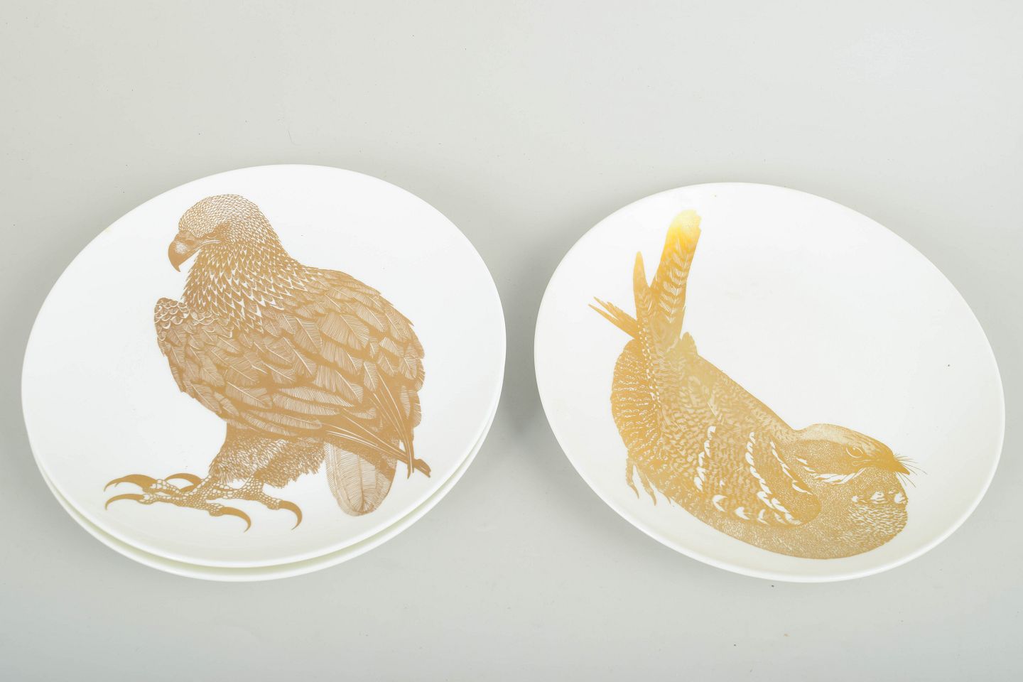 Paul Hoff for Gustavsberg, “Arter i fara”, sæt med tre tallerkener.Sæt bestående af tre samlertallerkener i porcelæn med fuglemotiver udført i gulddekoration. Tallerkenerne er en del af serien “Arter i fara”; modelbetegnelserne fremgår af bagsidens tryk med titel, serienummer og artsbeskrivelse. Produceret i begrænset oplag i 1980’erne.