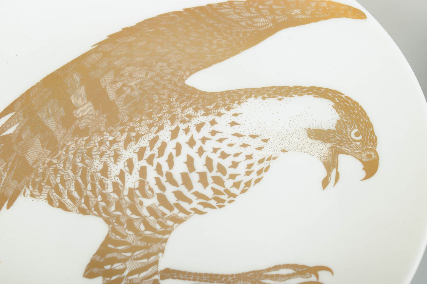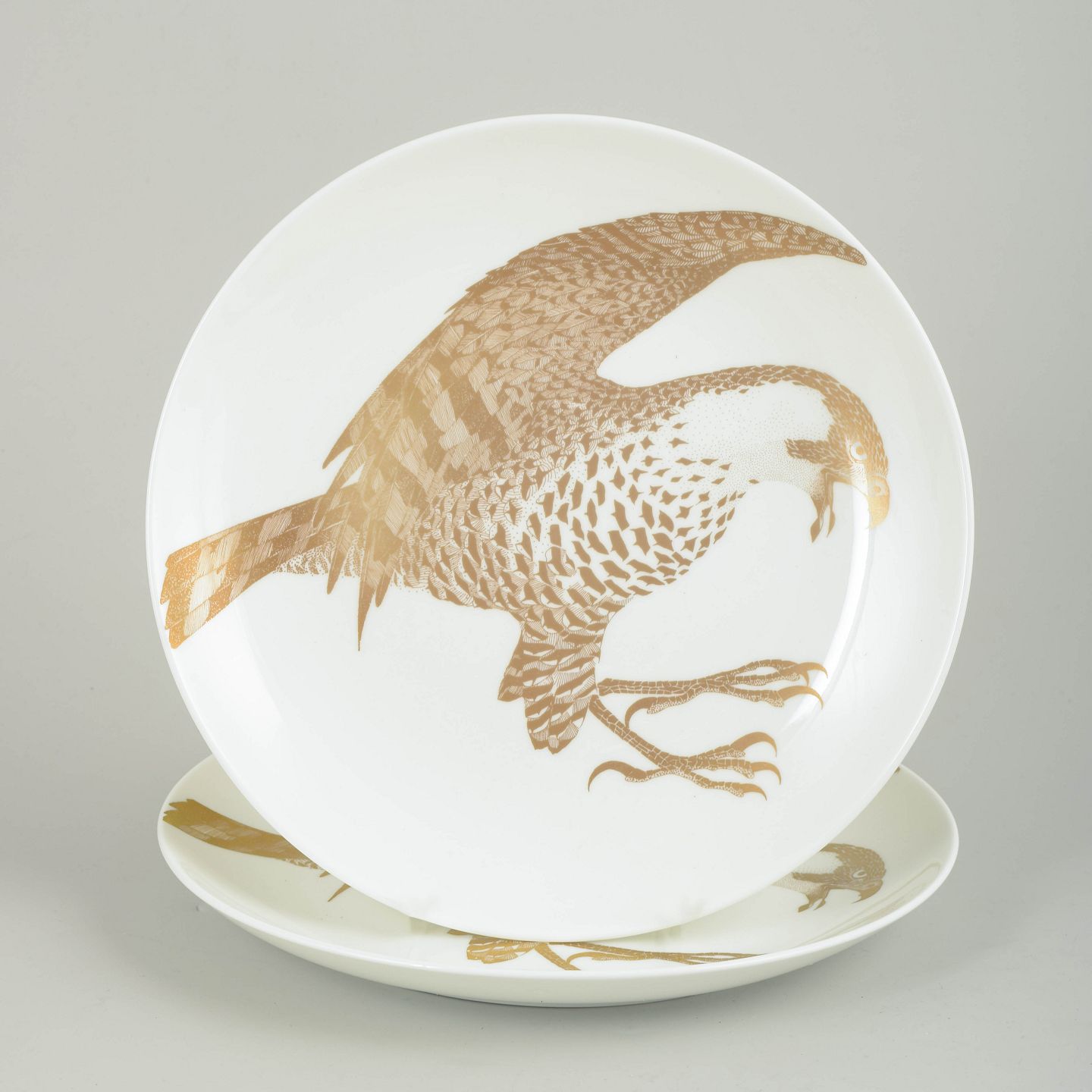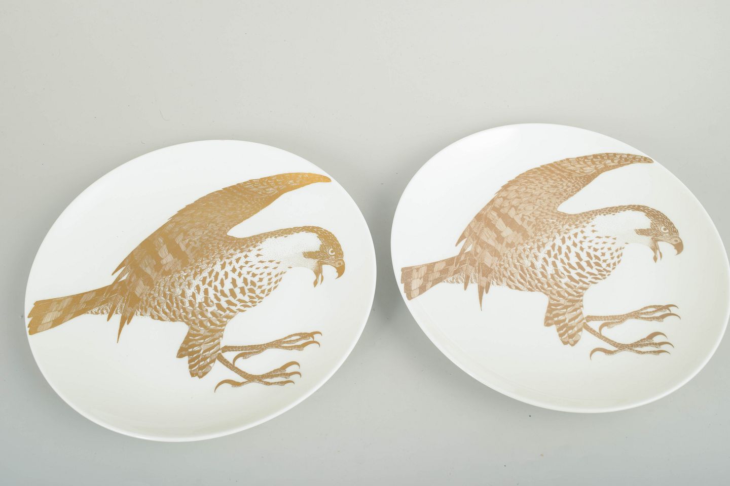 Paul Hoff for Gustavsberg, “Arter i fara”, sæt med to tallerkener.Sæt bestående af to samlertallerkener i porcelæn med motiv af havørn udført i gulddekoration. Tallerkenerne indgår i serien “Arter i fara”, model Havsörn, produceret i begrænset oplag i 1980’erne. Bagsiden er trykt med titel, serienummer og en kort naturhistorisk tekst om arten.