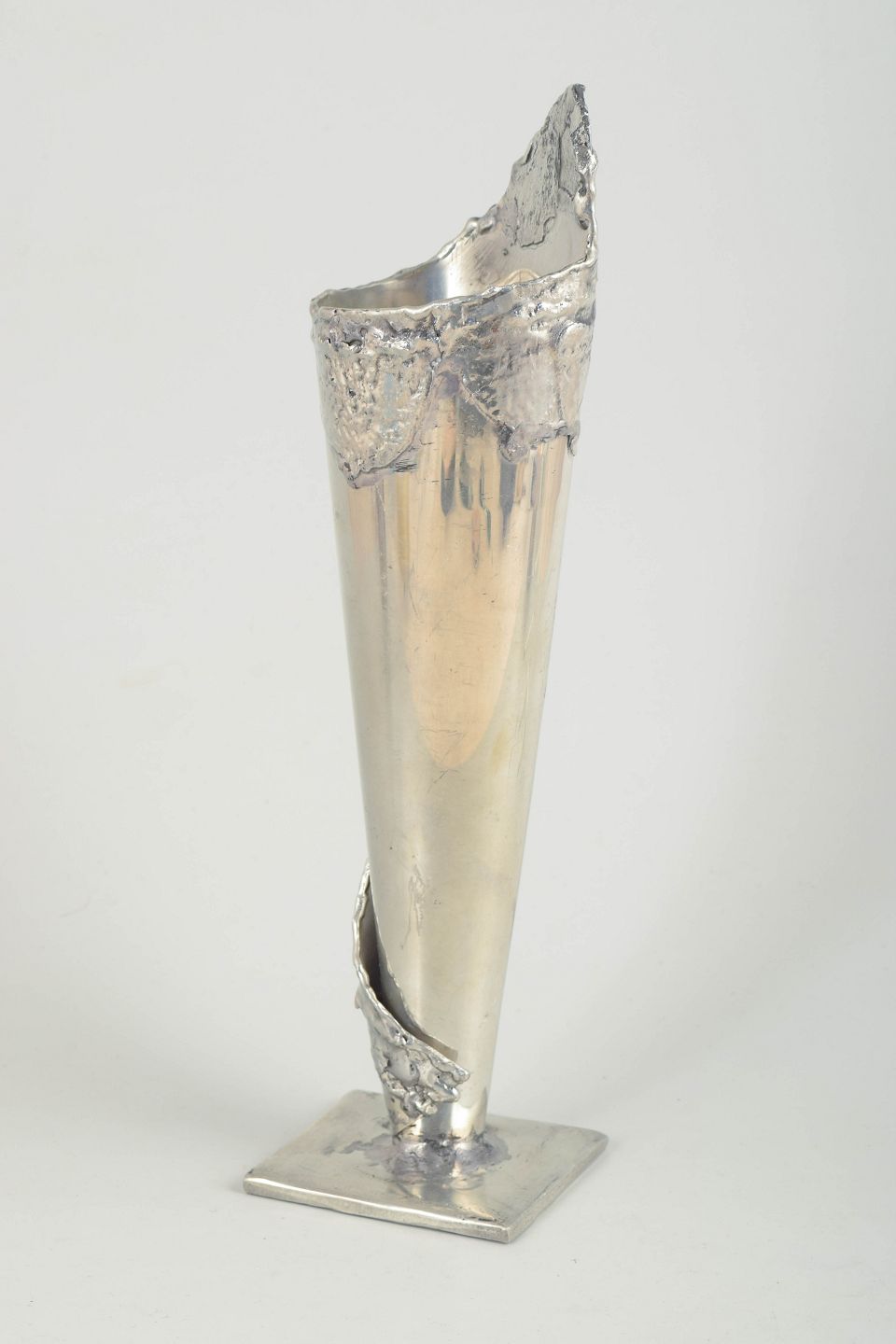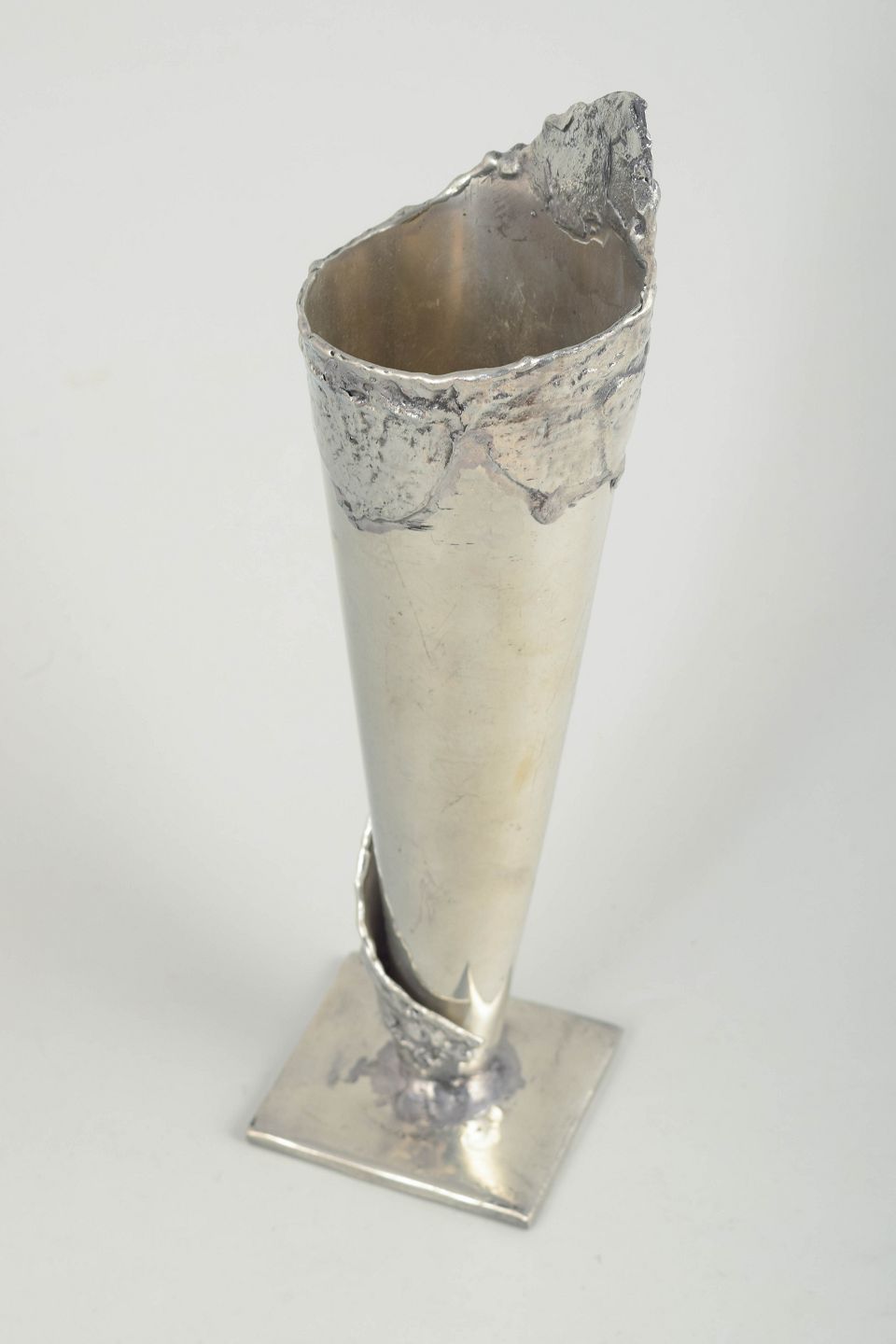 Bengt Berggren, stor tinvase i brutalistisk stil, 1980’erne.Skulpturelt udformet vase i tin med høj, konisk krop og rå, organisk kant med struktureret overflade. Monteret på kvadratisk fod.