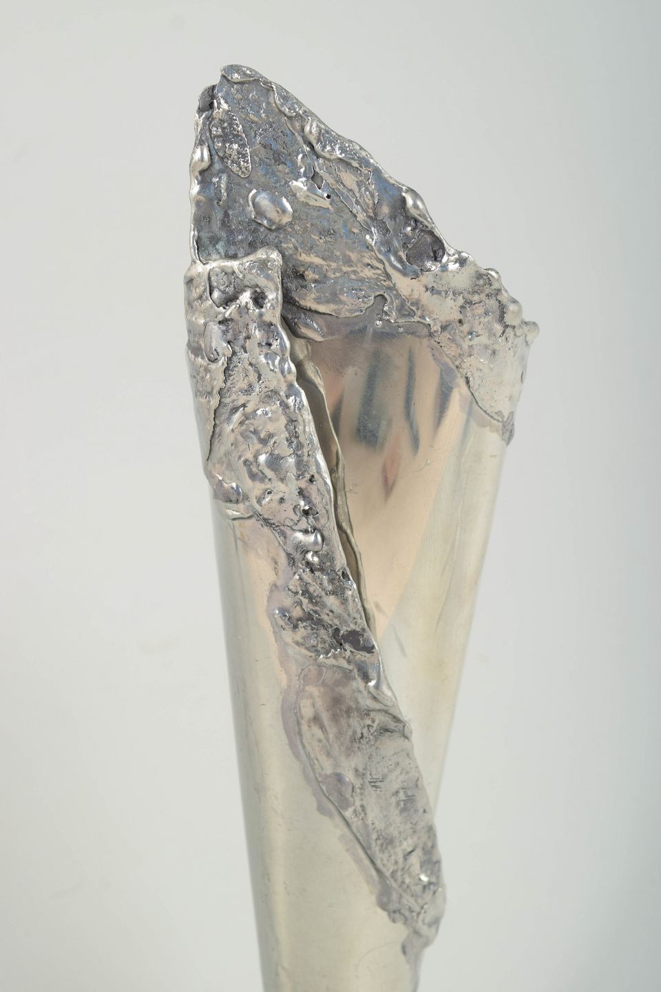 Tin har en lang tradition i svensk kunsthåndværk og blev i det sene 1900-tal ofte brugt til skulpturelle, håndforarbejdede former med bevidst rå og organisk afslutning. Vaser som denne ligger i forlængelse af 1980’ernes interesse for materialets taktile kvaliteter og et mere frit, kunstnerisk udtryk i brugskunst.