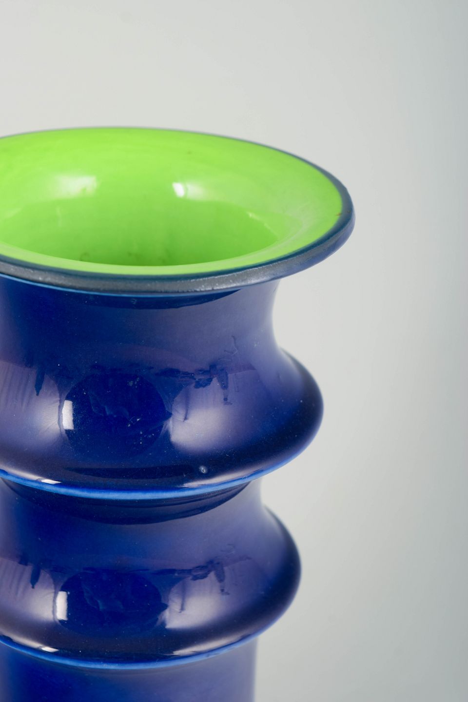 Skulpturel, balusterformet vase i glaseret stentøj med dyb koboltblå glasur og kontrasterende limegrøn glasur indvendigt; typisk 1970’er-modernisme med tydelig profilering og en markant farvevirkning.