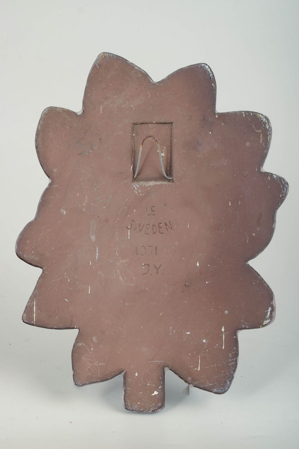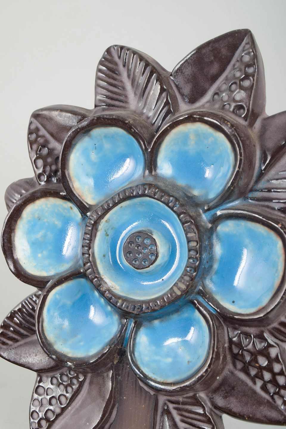 Irma Yourstone for Upsala Ekeby, vægrelief.Dekorativt vægrelief i glaseret keramik formet som stiliseret blomst med bladmotiv. Relieffet er udført i brune toner med kontrasterende lyseblå, blankglaserede felter, der giver et markant og plastisk udtryk. Overfladen kombinerer relief, rytme og farvespil i et klart modernistisk formsprog. Modelnummer 1071.