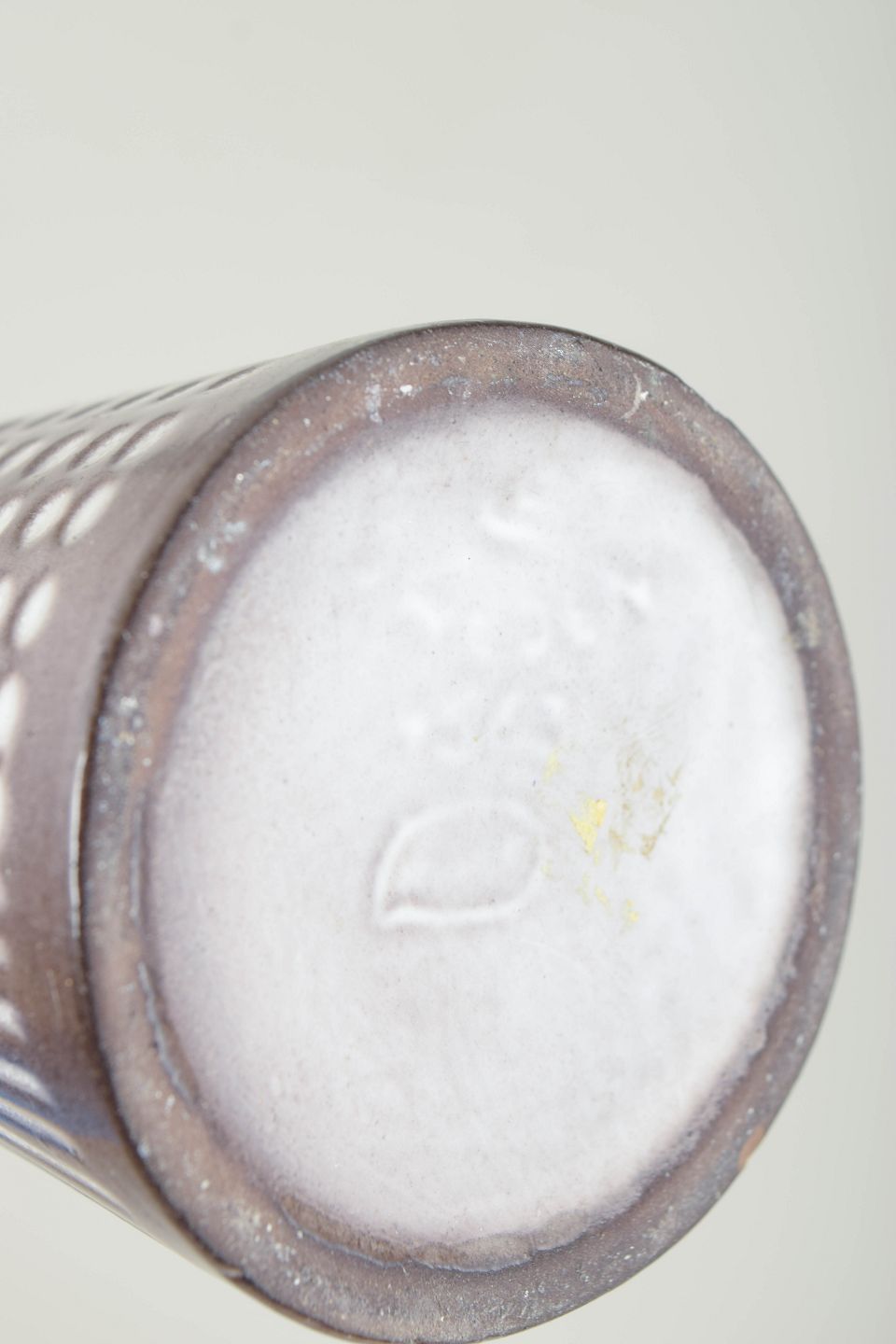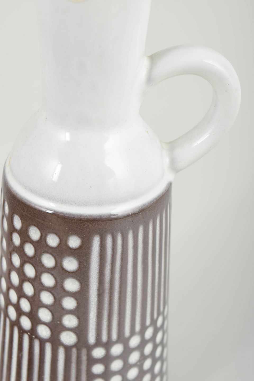 Mari Simmulson for Upsala Ekeby, kande.Slank, cylindrisk kande i glaseret keramik med smal hals og enkelt hank. Underdelen er dekoreret med grafiske prik- og stregmønstre i hvid mod brun bundglasur, mens den øvre del er udført i hvid glasur. Dekorationen fremstår stram og rytmisk med et tydeligt modernistisk udtryk. Modelnummer 4563.
