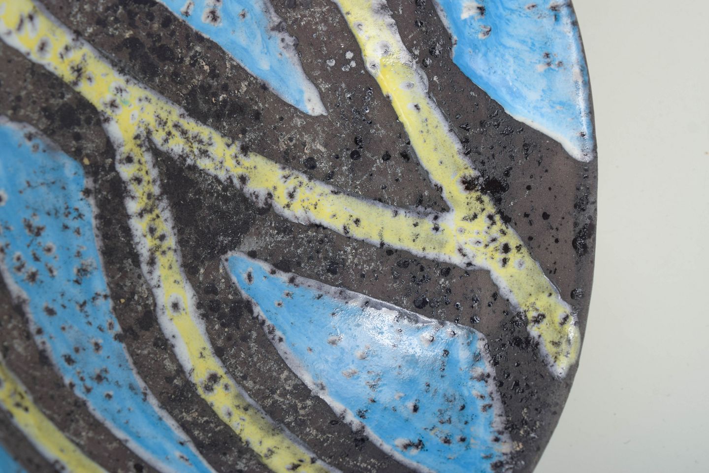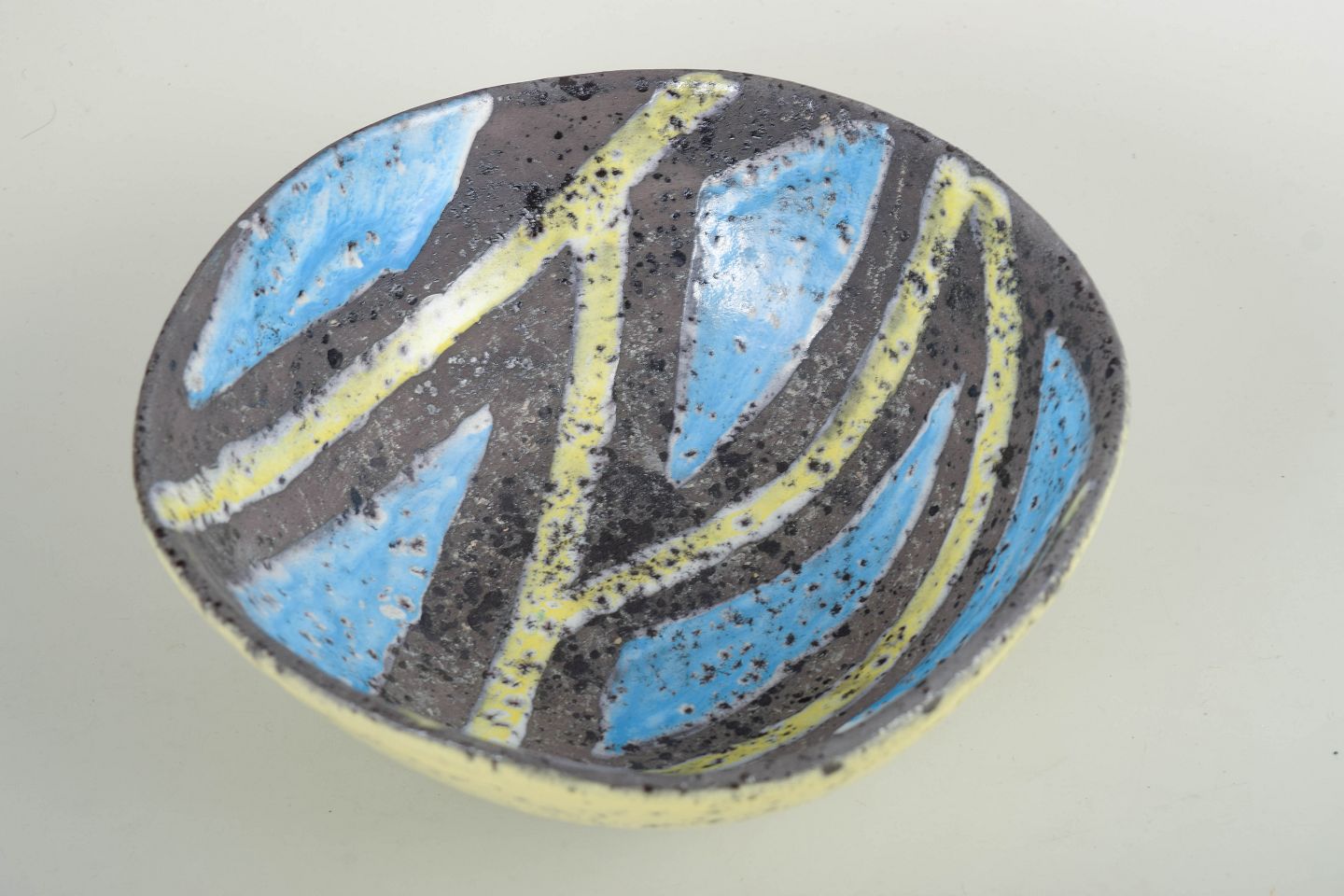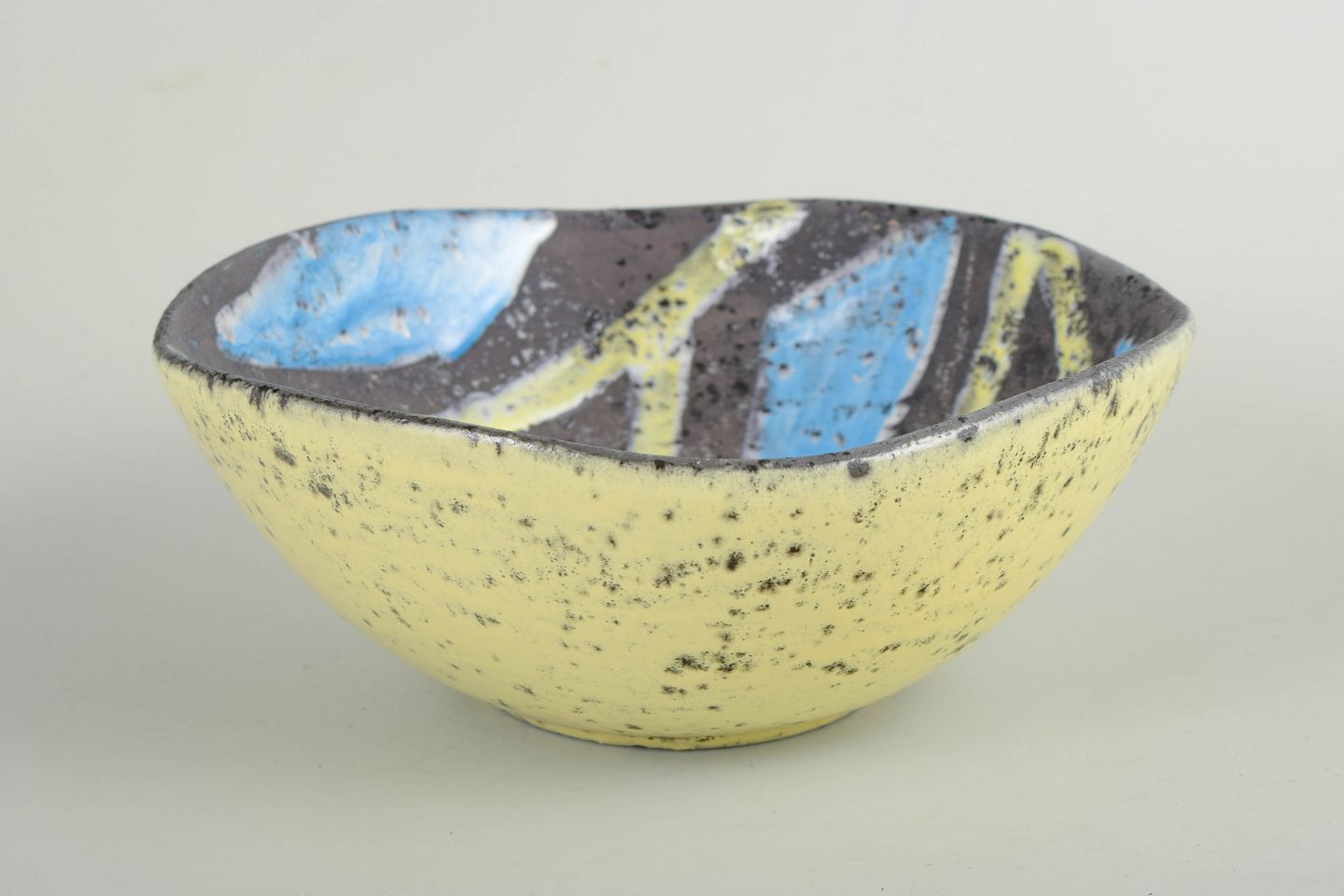 Guido Gambone for Bitossi, skål.Skål i glaseret keramik med rund, let konisk form og hånddekoreret inderside i abstrakt mønster med blå, gule og mørke felter. Ydersiden er dækket af en gul glasur med karakteristisk sprøjtet overflade, typisk for Gambones arbejde i perioden.