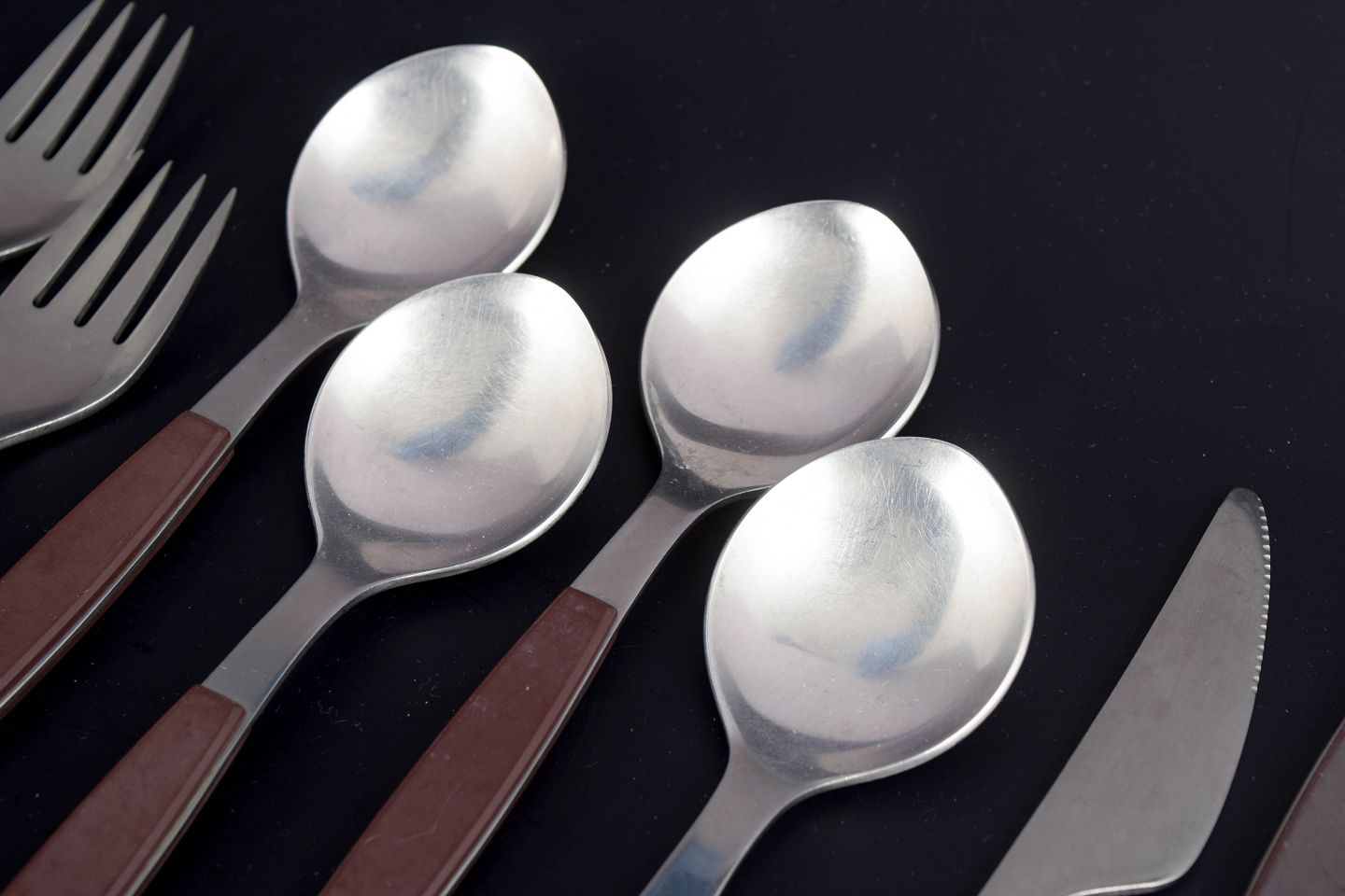 Henning Koppel for Georg Jensen, bestiksæt til 4 personer.Sæt bestående af fire middagsknive, fire middagsgafler og fire spiseskeer i rustfrit stål med brune håndtag. Modellen er fra Strata-serien.