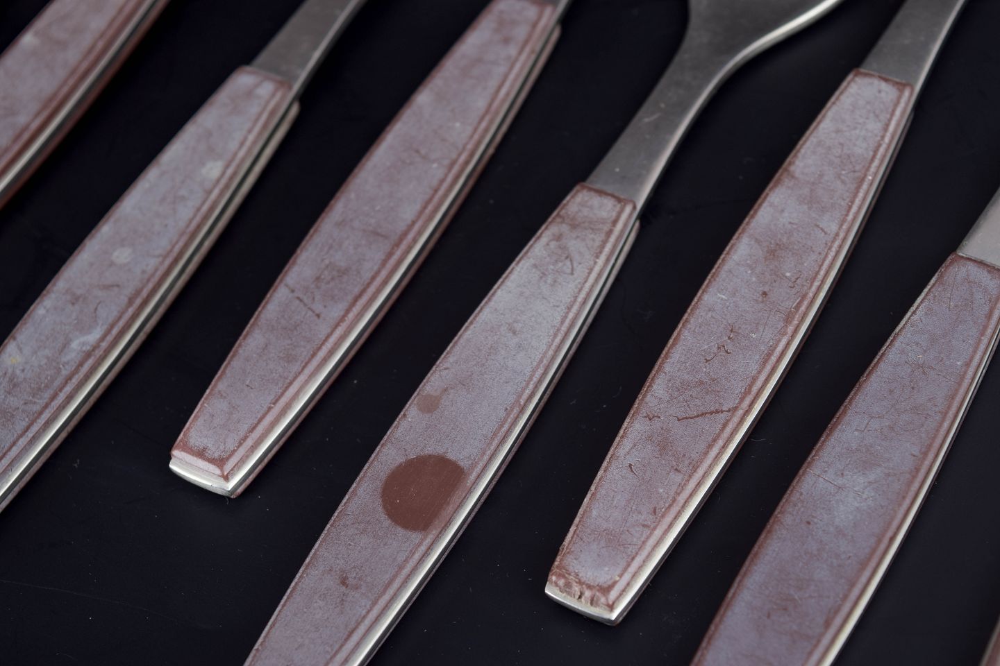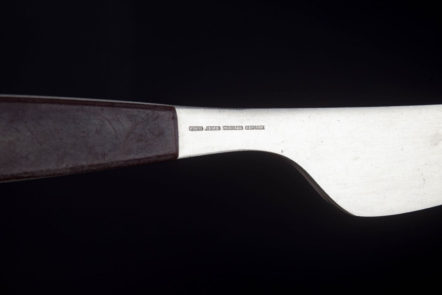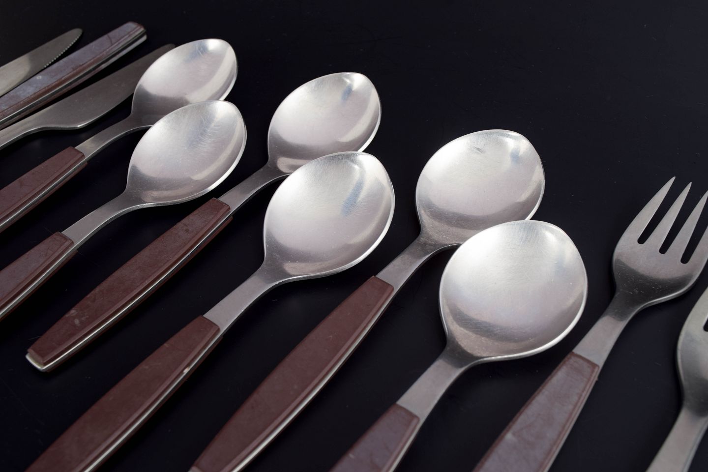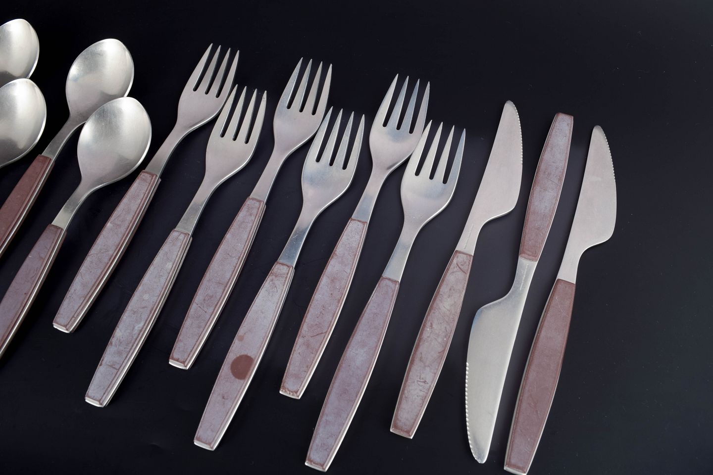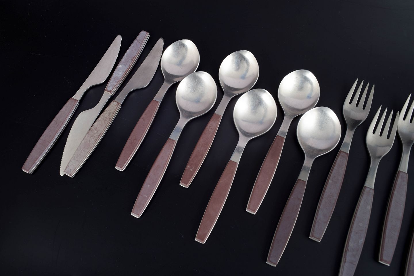 Henning Koppel for Georg Jensen, Strata bestiksæt til 6 personer.Komplet sæt bestående af seks middagsknive, seks middagsgafler og seks spiseskeer i rustfrit stål med brune håndtag. Modellen er fra Strata-serien.