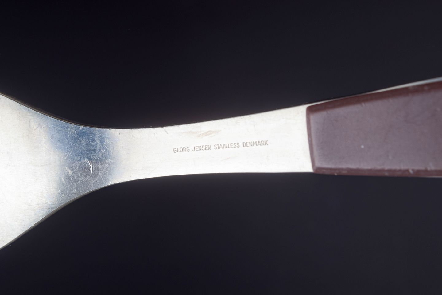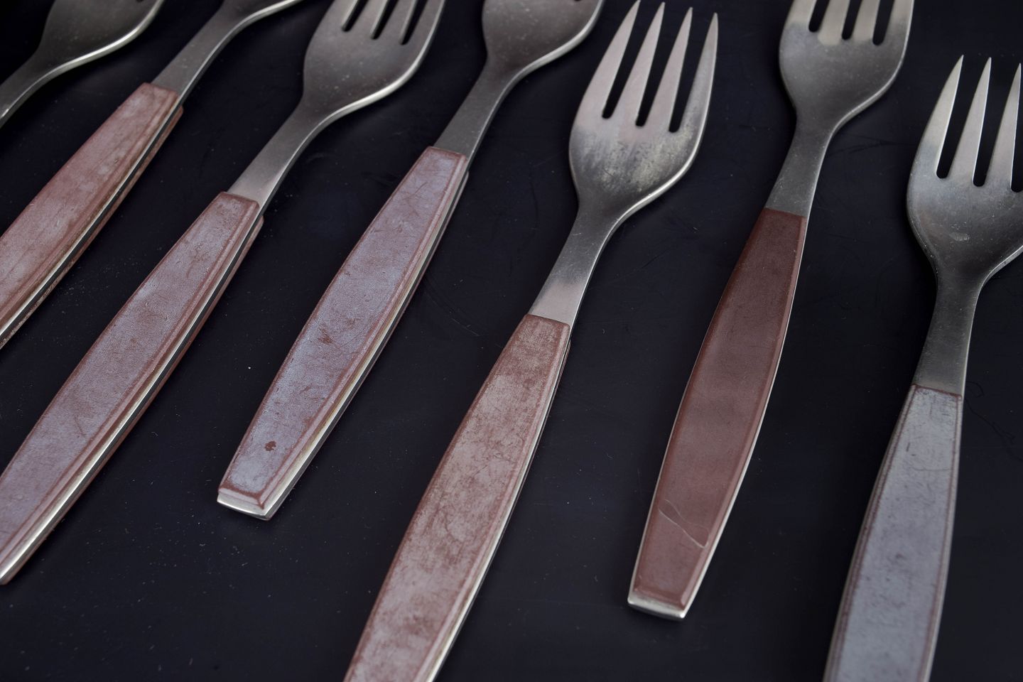 Henning Koppel for Georg Jensen, middagsgafler.Sæt bestående af otte middagsgafler i rustfrit stål med brune håndtag. Modellen er fra Strata-serien.