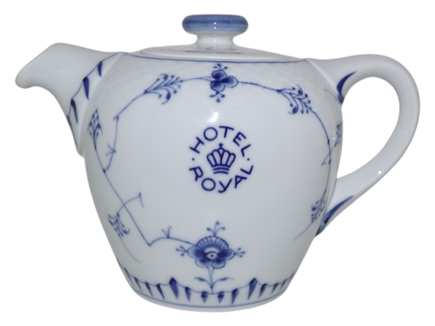 Bing & Grøndahl Blåmalet / Musselmalet tykt jernporcelæn, lille tekande med logo fra Hotel Royal.Af fabriksmærket ses det, at denne er produceret mellem 1948 og 1952.