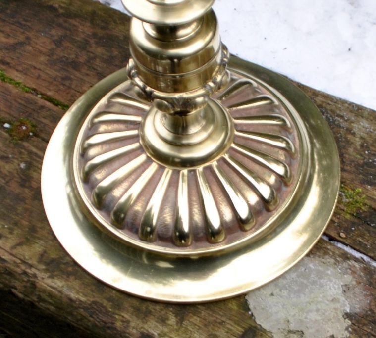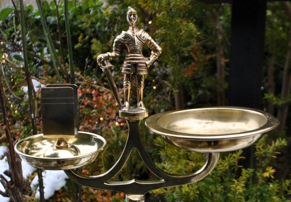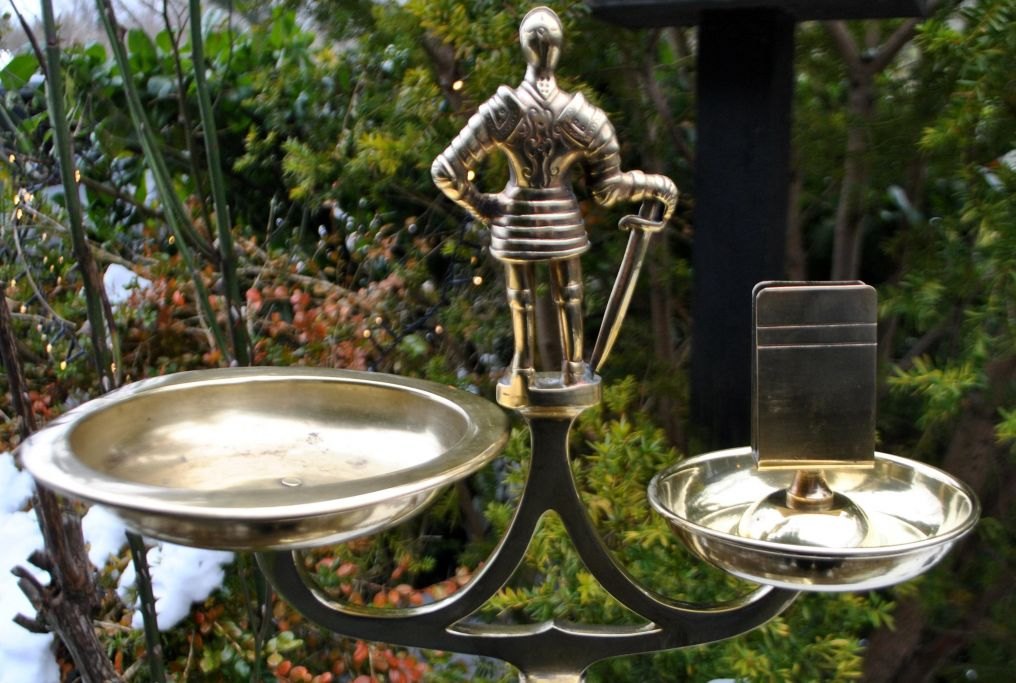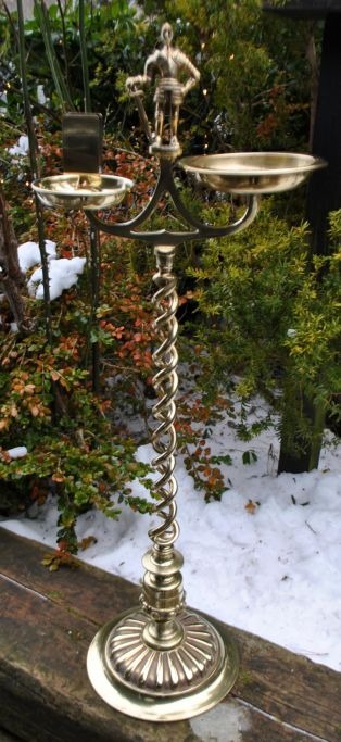 Messing stander med askebæger og tændstiksholder, 19. årh. Med dobbelt-snoet søjle og på toppen dekoreret med en ridder i rustning. På rund fod. H: 86 cm. B: 32 cm.NB:: Der ydes ingen rabat på dette lot!