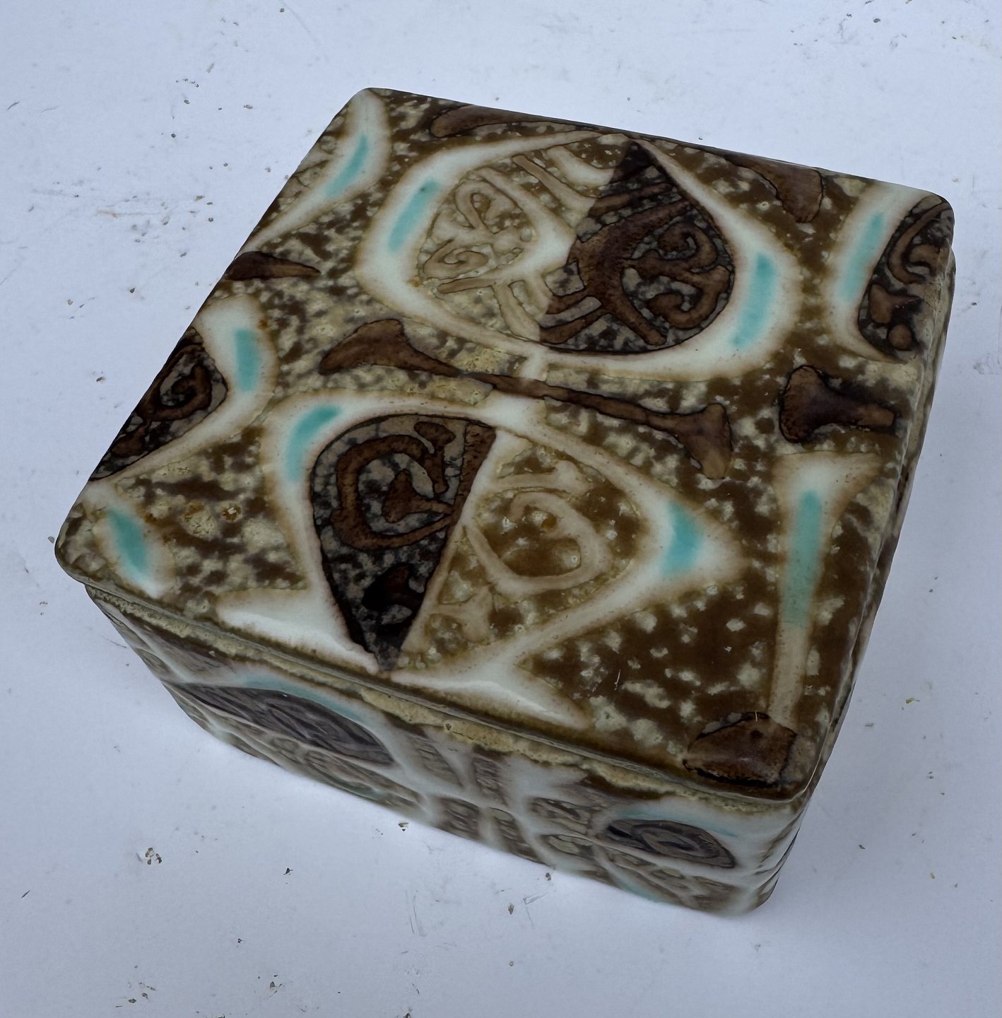 Nils Thorsson: Kvadratisk lågskål i fajance fra Royal Copenhagen designet af den svenske designer. Fremstår i perfekt stand. Mål: H. 4,2 cm samt 7,8 x 7,8 cm