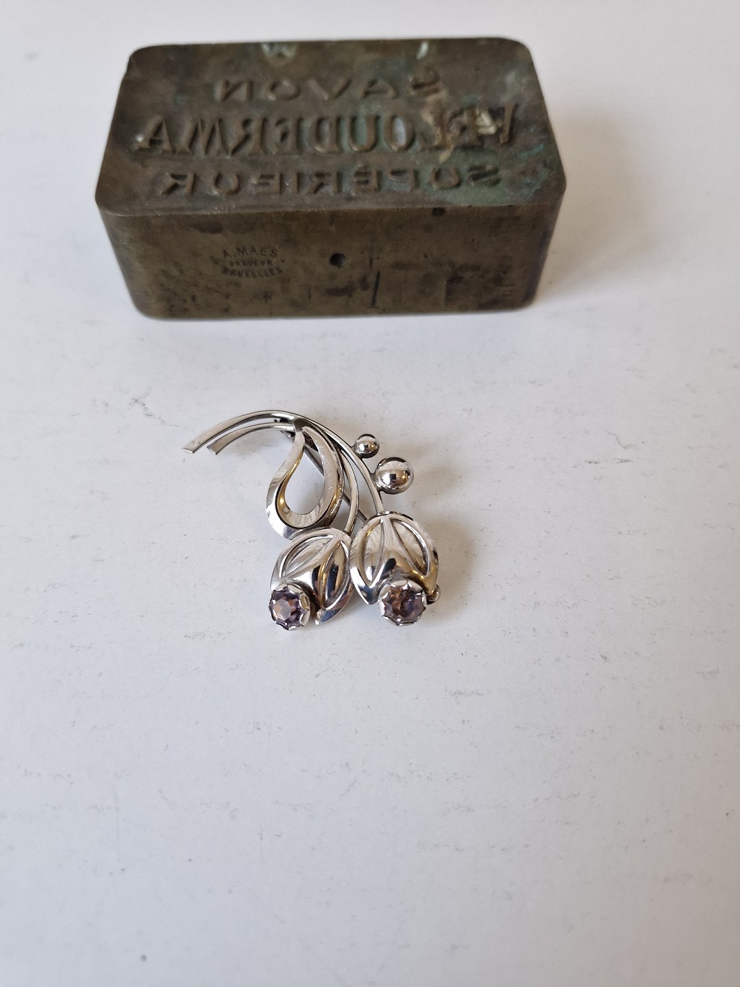 Vintage sølv broche i form af blade og blomster med lilla sten af Hermann SiersbølStemplet: HS - Sterling - Denmark