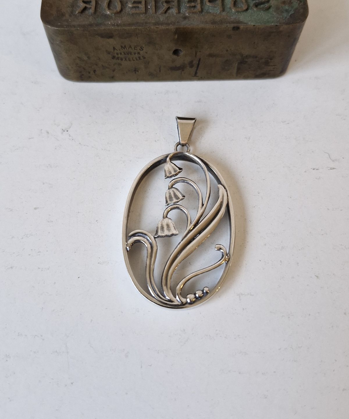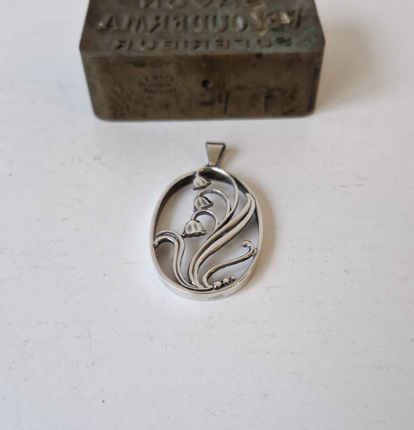 Hugo Grün sølv vedhæng dekoreret med liljekonvalStemplet: H.Gr - 830s