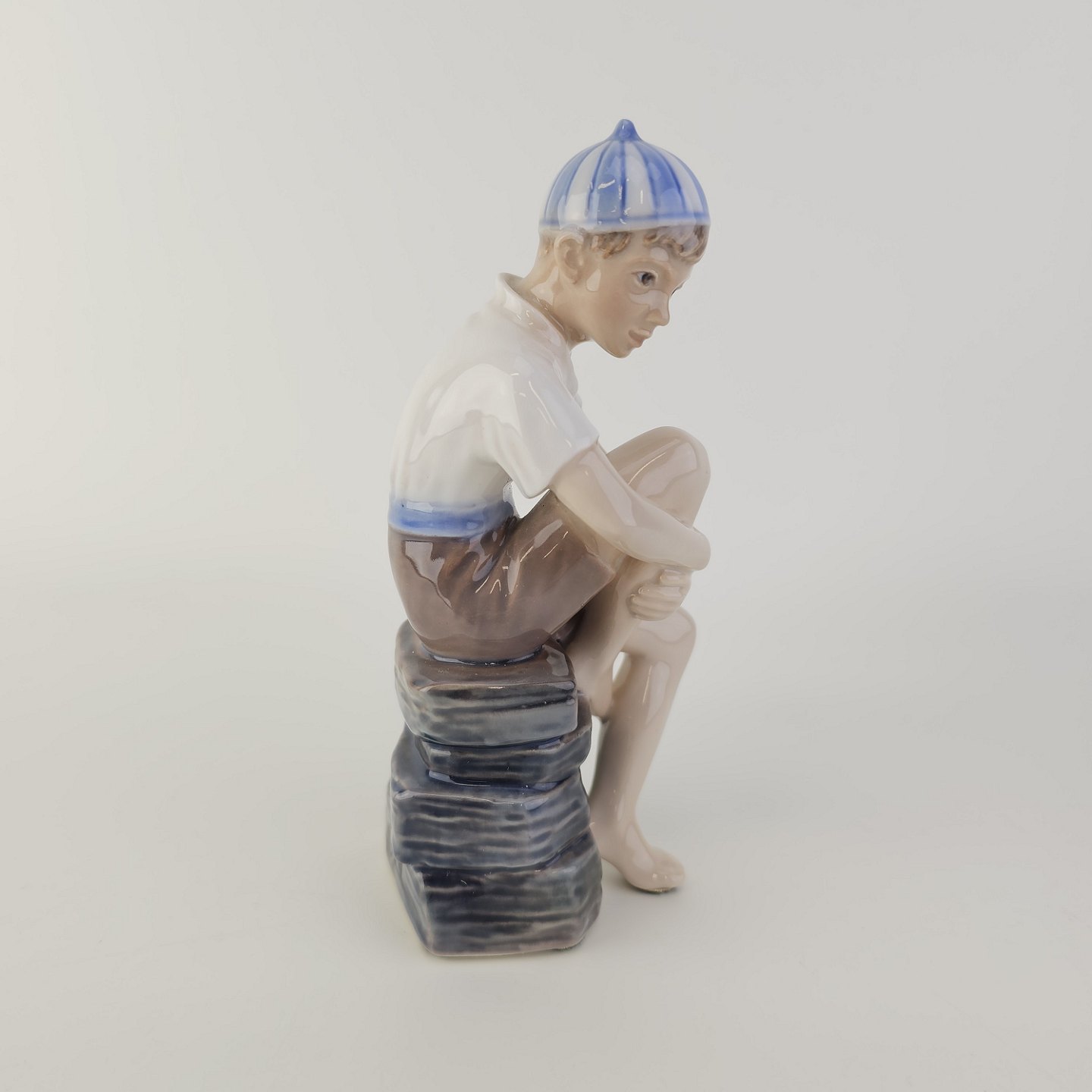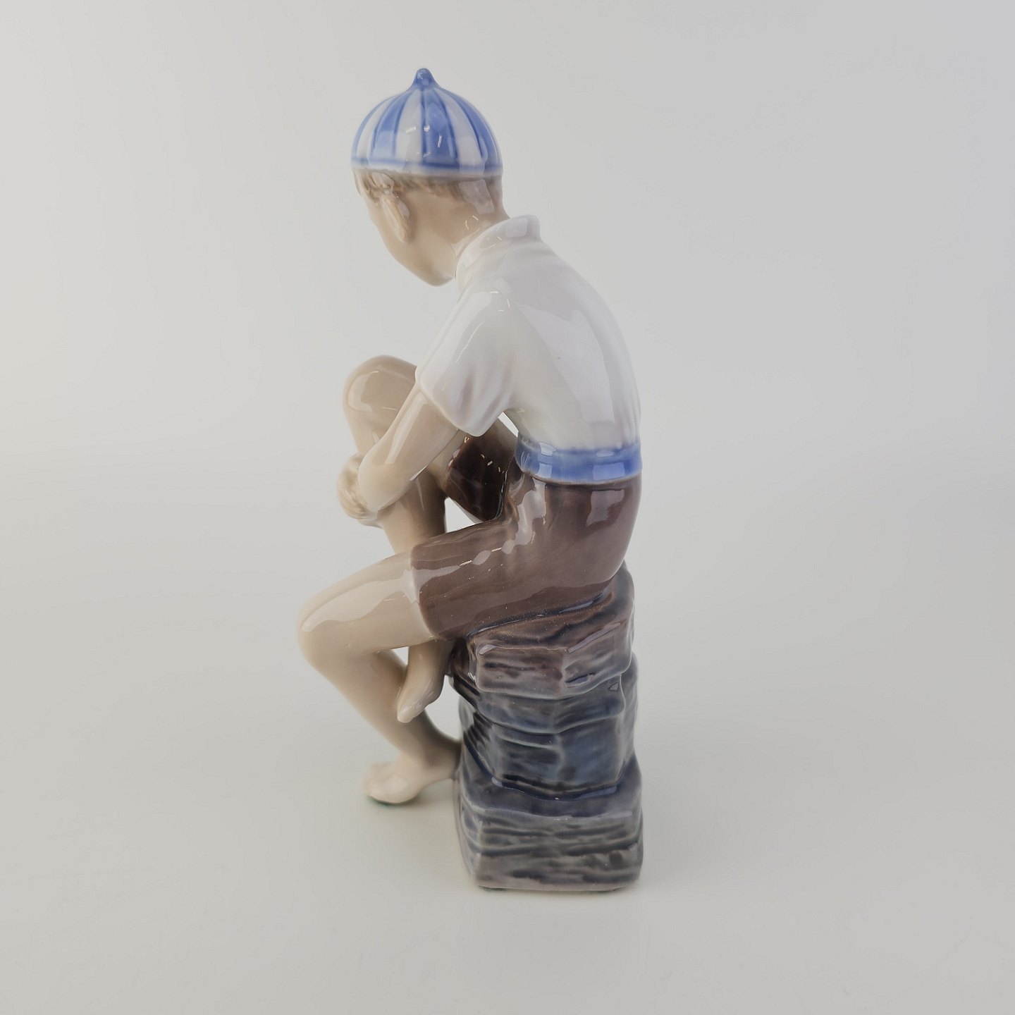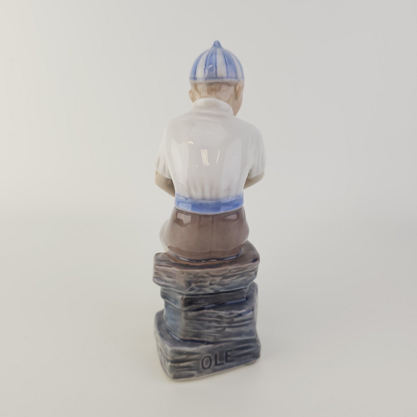 Figur i hvidt porcelæn med motiv af en dreng med navnet Ole i en stribet kasket, som sidder på stenNr. 1328