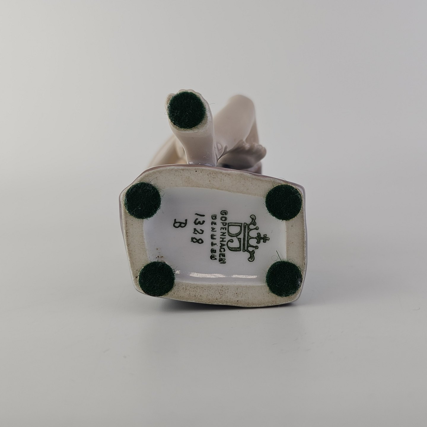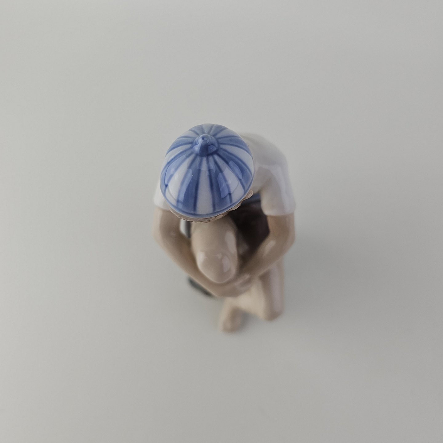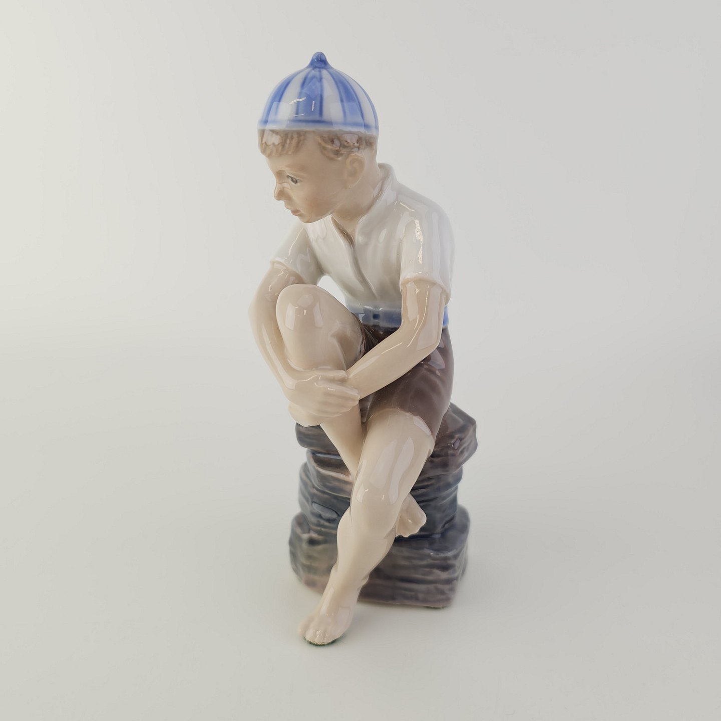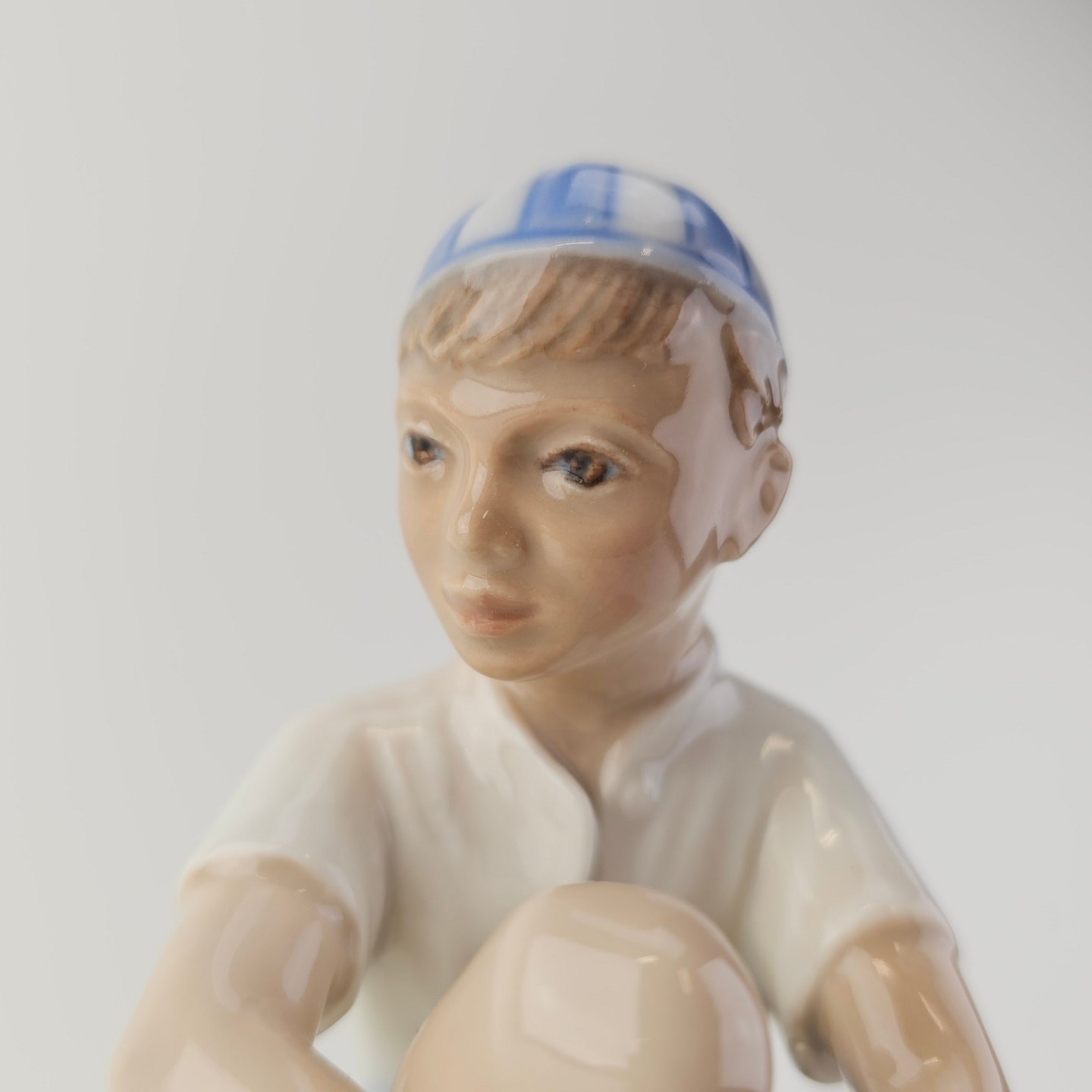 Figur i hvidt porcelæn med motiv af en dreng med navnet Ole i en stribet kasket, som sidder på stenNr. 1328