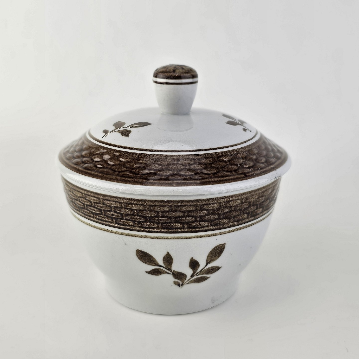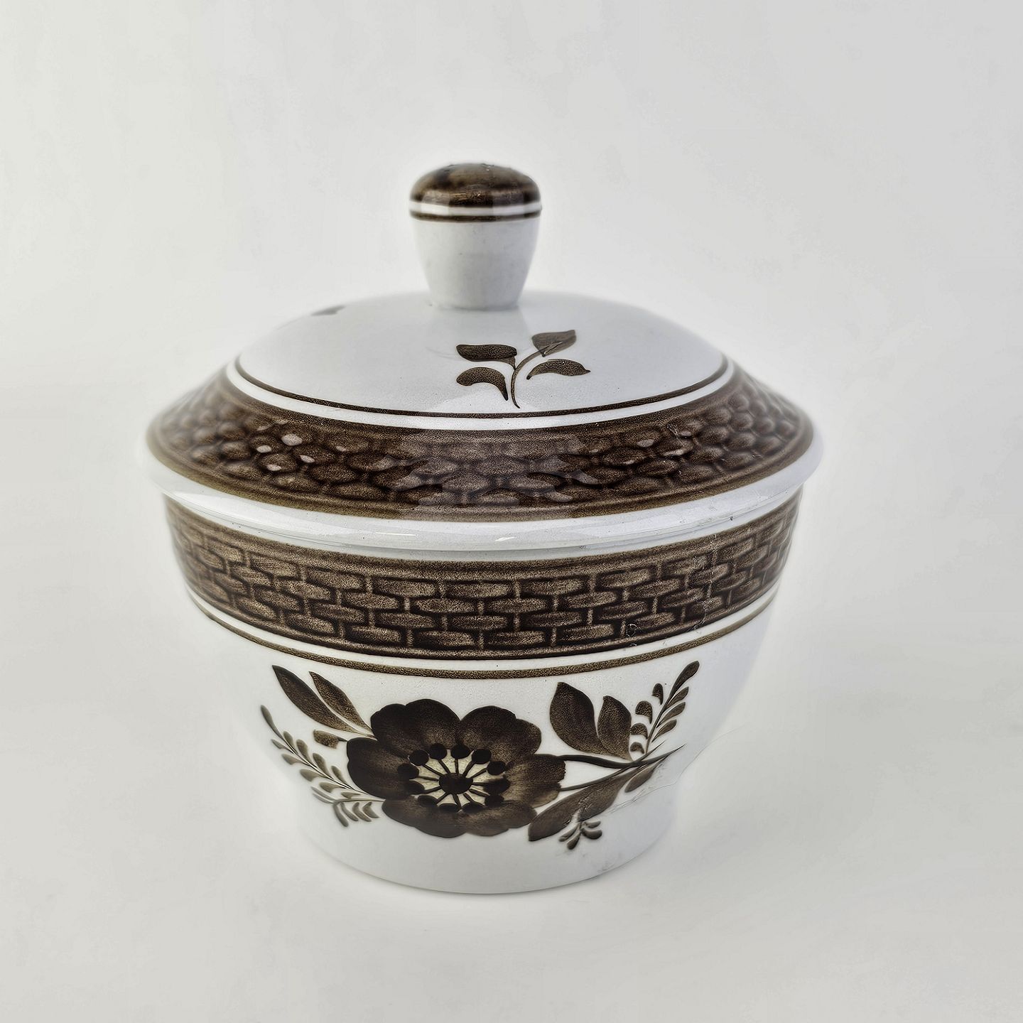 Sukkerskål med låg i fajance fra stellet Brun Tranquebar fra år 1919Nr 45/953