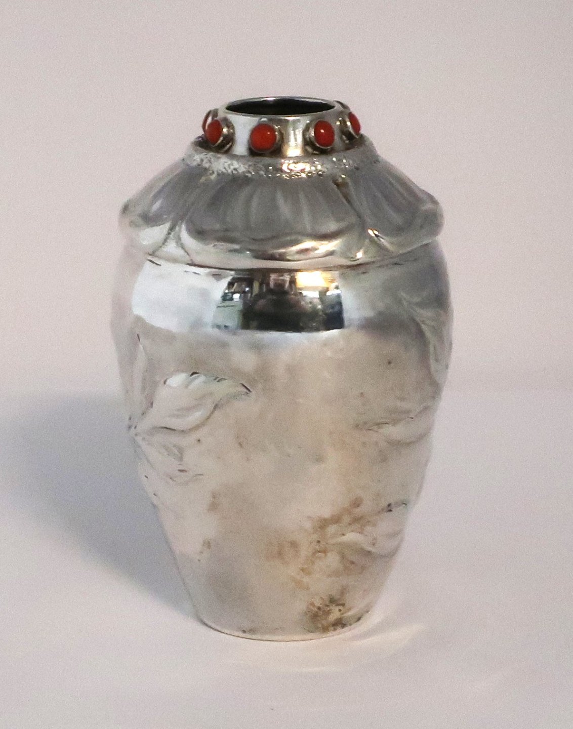 Knud Georg Jensen, København (KGI). Lille sølvvase med sten (830). Højde 10 cm. Produceret 1917. Udstiller