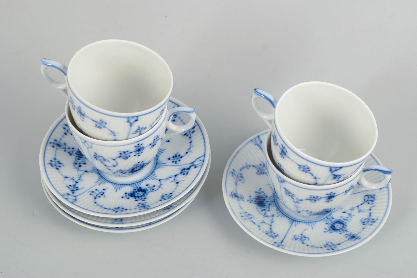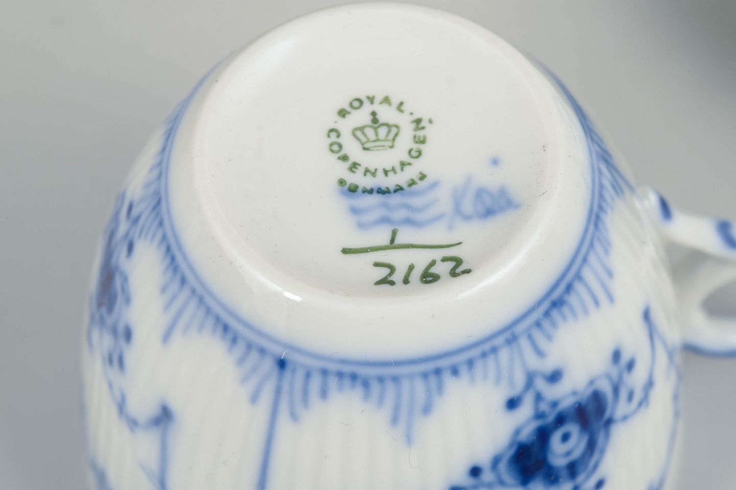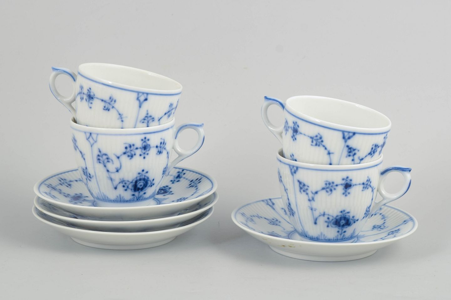 Royal Copenhagen, Musselmalet Riflet, kaffestel til 4 personer.Kaffestel i porcelæn fra serien Musselmalet Riflet, bestående af kopper og underkopper til fire personer, model 1/2162. Klassisk riflet form med håndmalet blå dekoration.