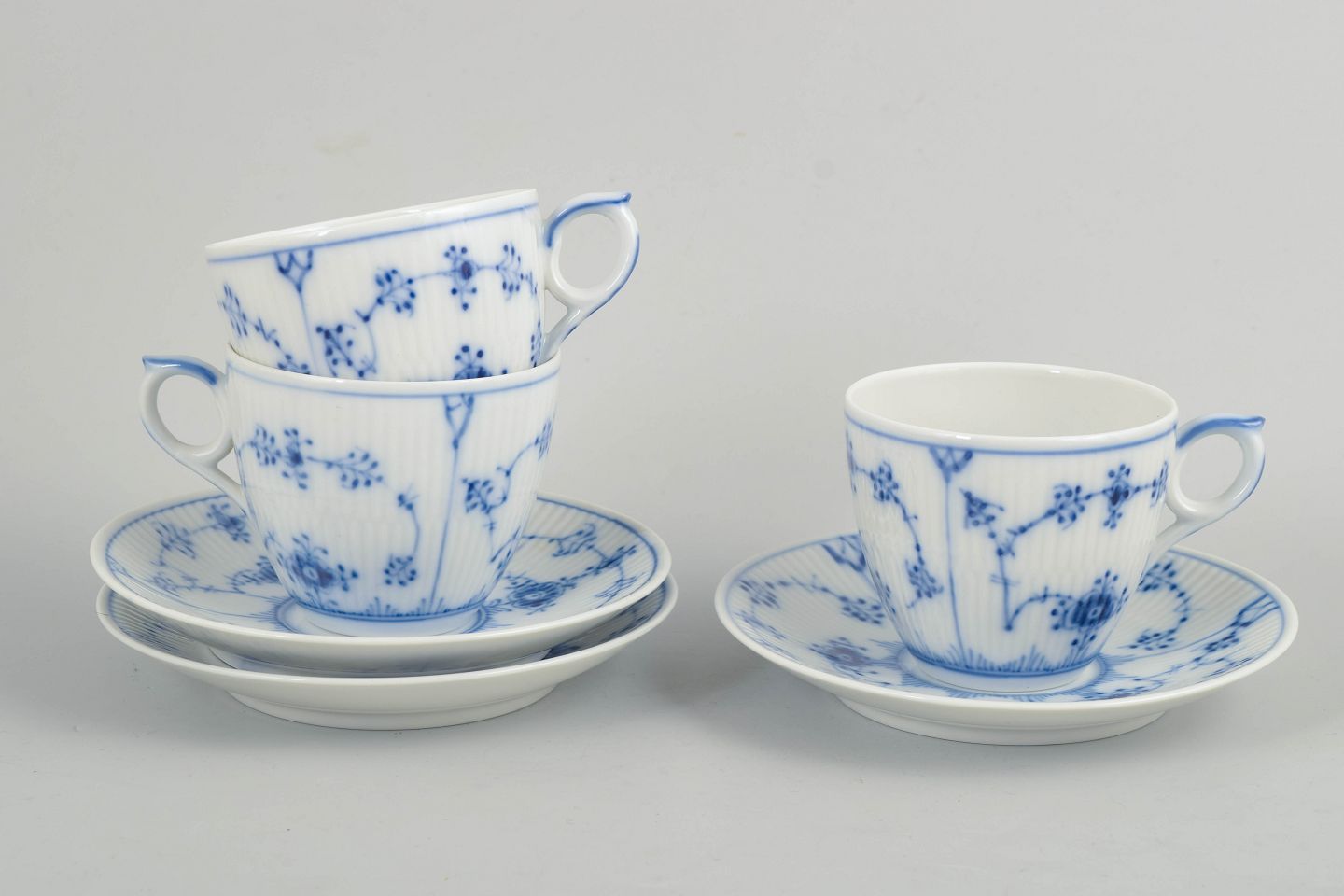 Royal Copenhagen, Musselmalet Riflet, kaffestel til 3 personer.Kaffestel i porcelæn fra serien Musselmalet Riflet, bestående af kopper og underkopper til tre personer, model 1/2162. Klassisk riflet form med håndmalet blå dekoration.