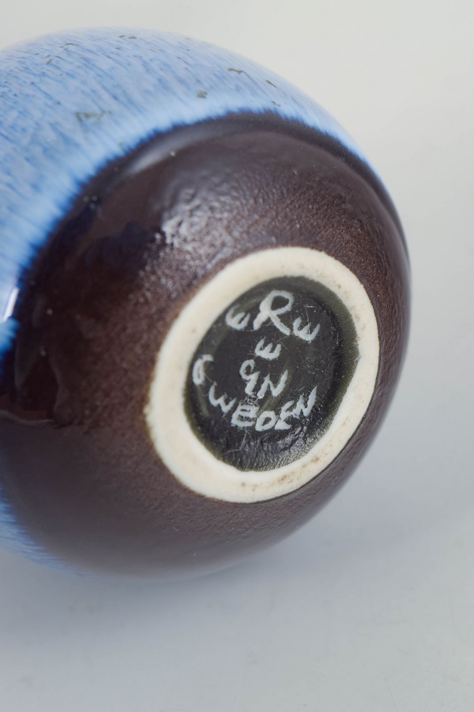 Gunnar Nylund for Rörstrand, miniature vase.Elegant balusterformet vase i glaseret stentøj med smal hals og afrundet bug. Overfladen er dækket af en levende blå glasur med fine lodrette spil og let mørkere rand ved mundingen. Modellen fremstår i første sortering og viser den sikre balance mellem form og glasur, der kendetegner Gunnar Nylunds arbejde for Rörstrand.