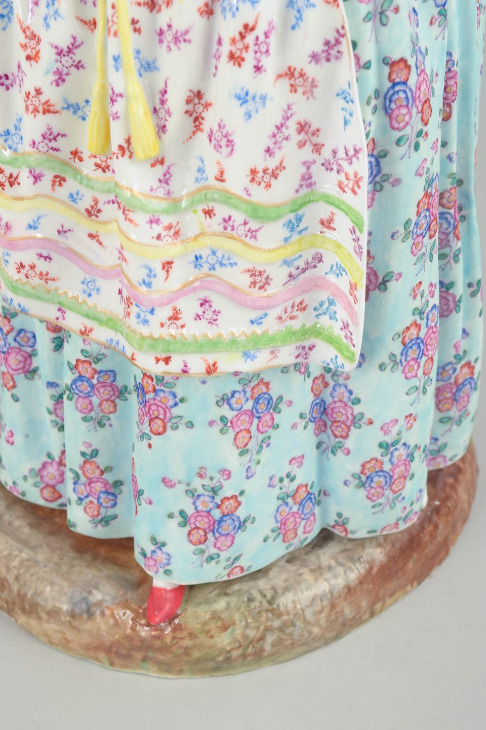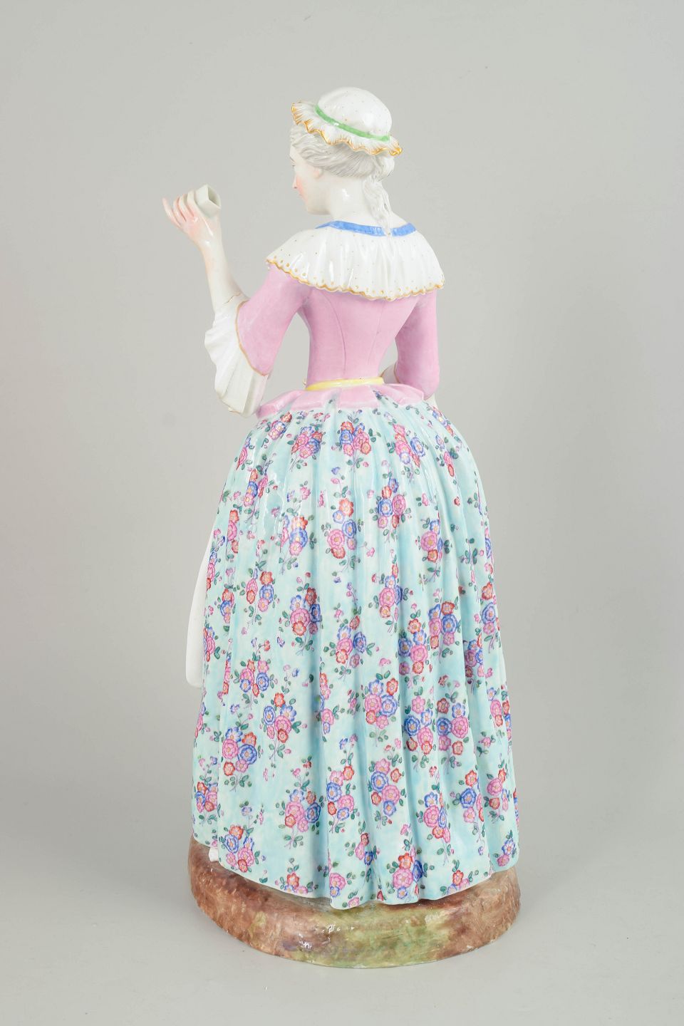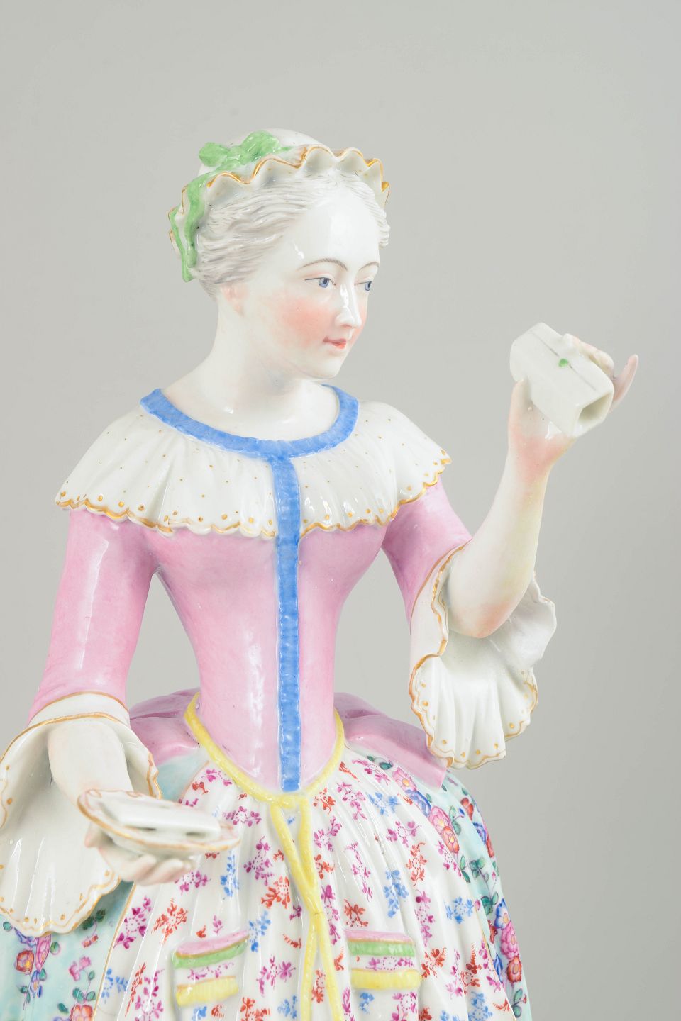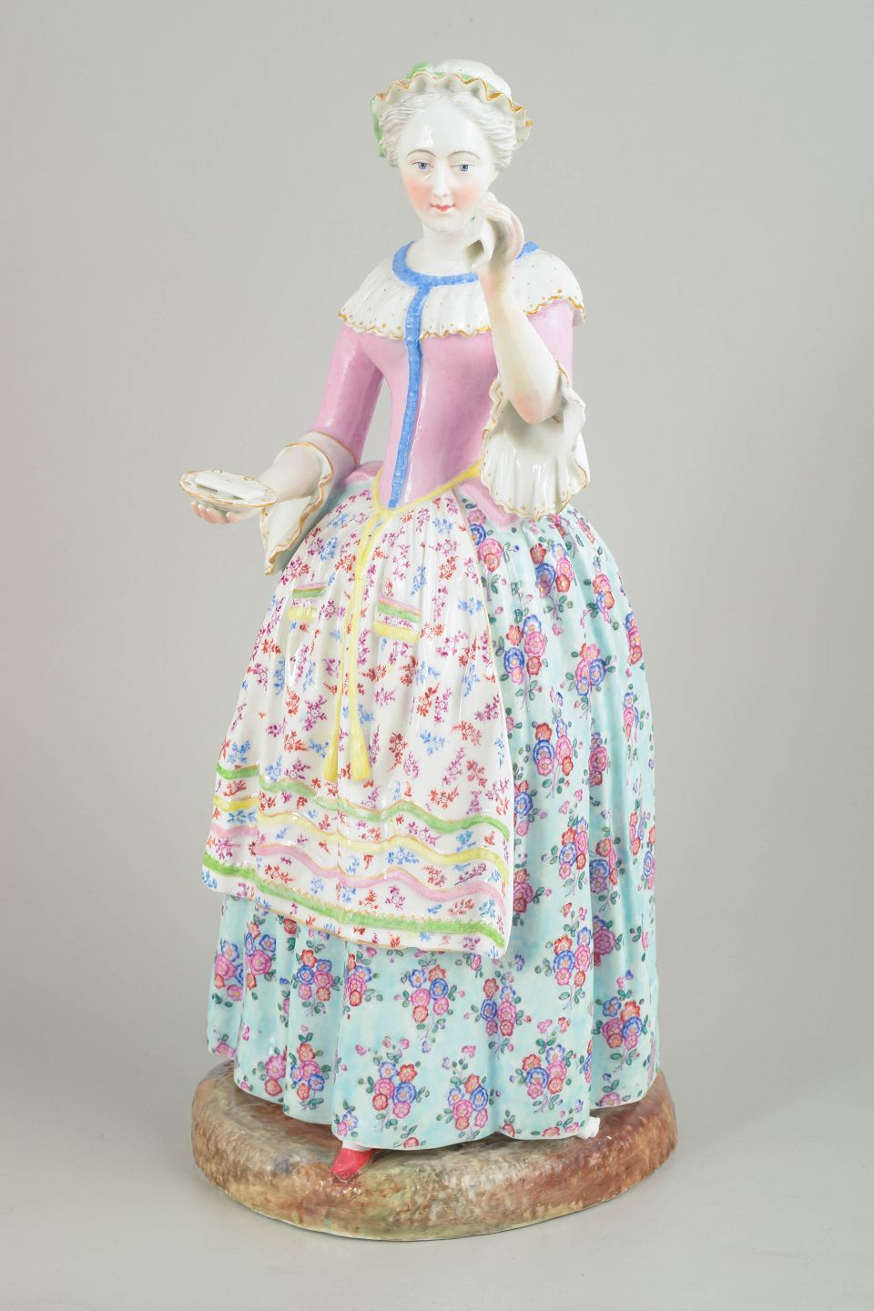 Meissen, La Belle Chocolatière, figur. Museumskvalitet.Stor Meissen porcelænsfigur fremstillet efter Jean-Étienne Liotards berømte motiv “La Belle Chocolatière” (1744). Figuren forestiller en kvinde i 1700-talsdragt med serveringsbakke og kop, rigt bemalet med polykrome blomsterdekorationer, fine ansigtstræk og detaljeret staffering. Udført efter model nr. 1471 og forsynet med Marcolini-mærke, dateret til ca. 1790’erne.